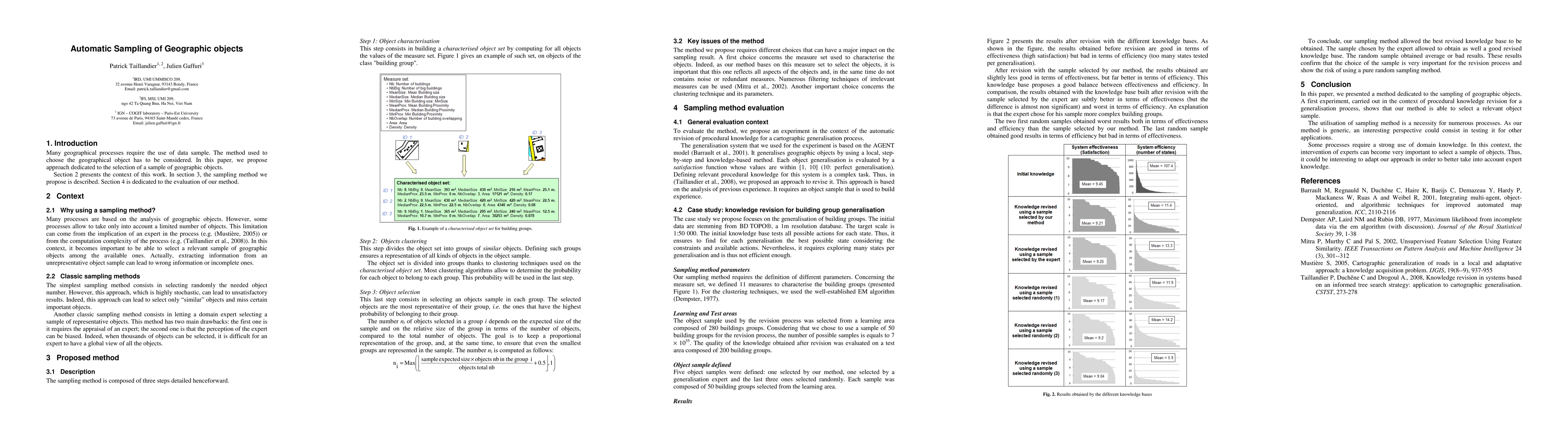 This research introduces a clustering-based sampling method to efficiently select representative geographic objects from large datasets, aiding processes that require expert analysis or intensive computation. The case study demonstrates that this approach effectively identifies relevant samples for geographic data generalization.