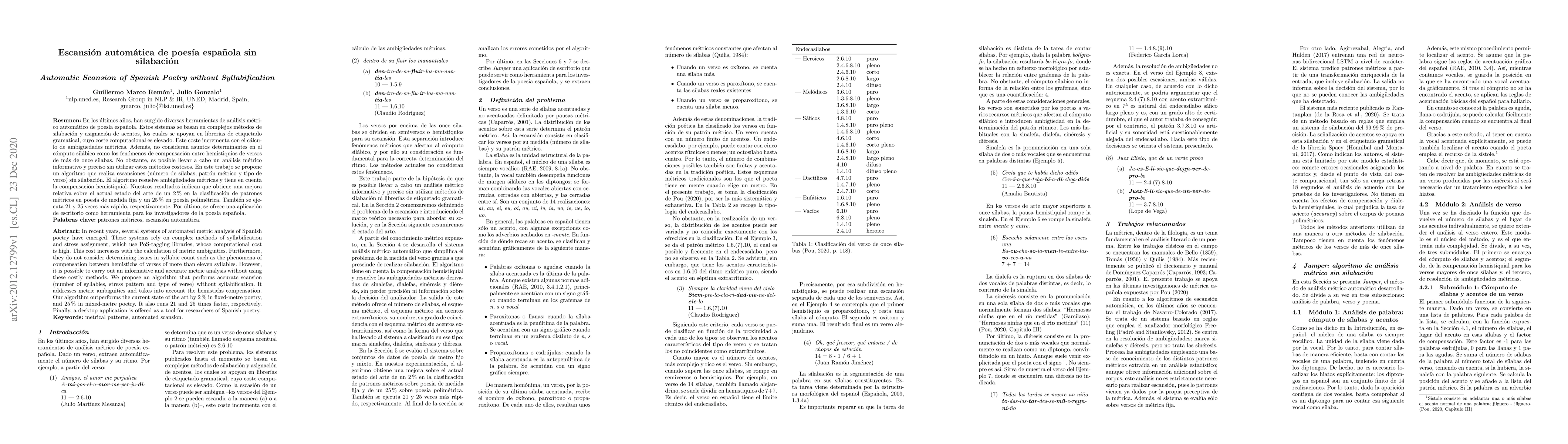 In recent years, several systems of automated metric analysis of Spanish poetry have emerged. These systems rely on complex methods of syllabification and stress assignment, which use PoS-tagging libraries, whose computational cost is high. This cost increases with the calculation of metric ambiguities. Furthermore, they do not consider determining issues in syllabic count such as the phenomena of compensation between hemistichs of verses of more than eleven syllables. However, it is possible to carry out an informative and accurate metric analysis without using these costly methods. We propose an algorithm that performs accurate scansion (number of syllables, stress pattern and type of verse) without syllabification. It addresses metric ambiguities and takes into account the hemistichs compensation. Our algorithm outperforms the current state of the art by 2% in fixed-metre poetry, and 25% in mixed-metre poetry. It also runs 21 and 25 times faster, respectively. Finally, a desktop application is offered as a tool for researchers of Spanish poetry.