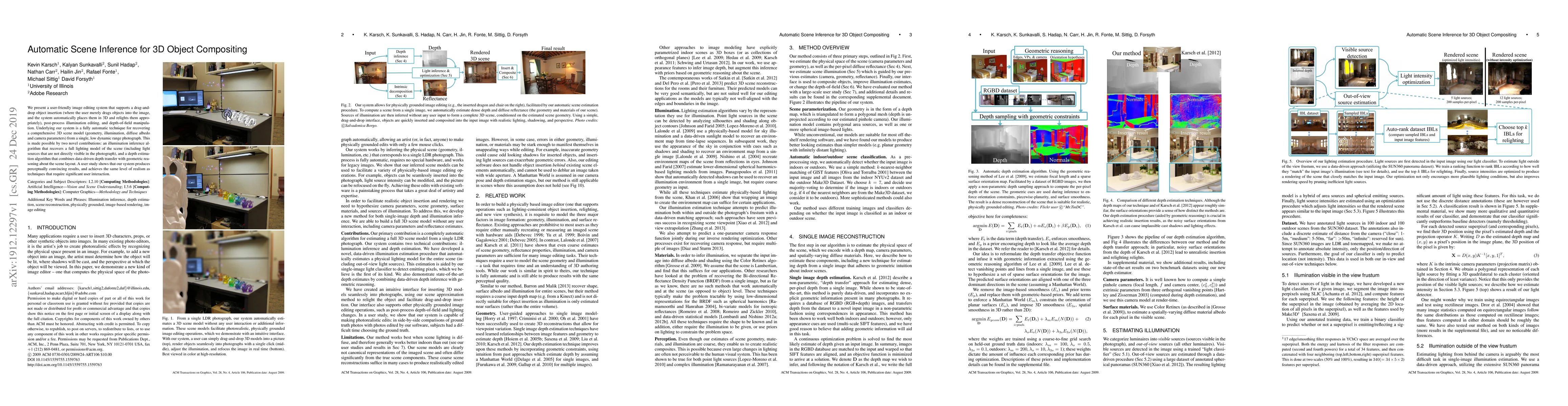 The research presents a system for automatic scene inference for 3D object compositing, utilizing a single low dynamic range photograph to recover a comprehensive 3D scene model, including geometry, illumination, diffuse albedo, and camera parameters. This is achieved through novel contributions: an illumination inference algorithm and a depth estimation algorithm combining data-driven depth transfer with geometric reasoning.
