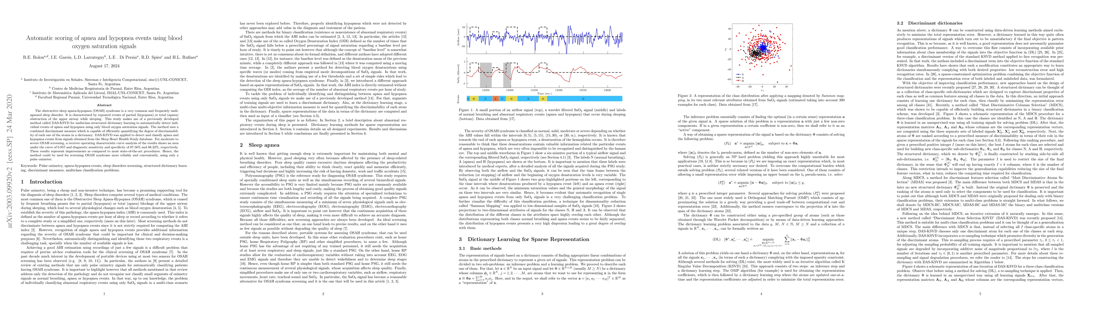 This study introduces DAS-KSVD for automatic detection of apnea and hypopnea events using blood oxygen saturation signals, achieving high sensitivity and specificity. The method shows promising results for reliable and convenient screening of obstructive sleep apnea-hypopnea syndrome.