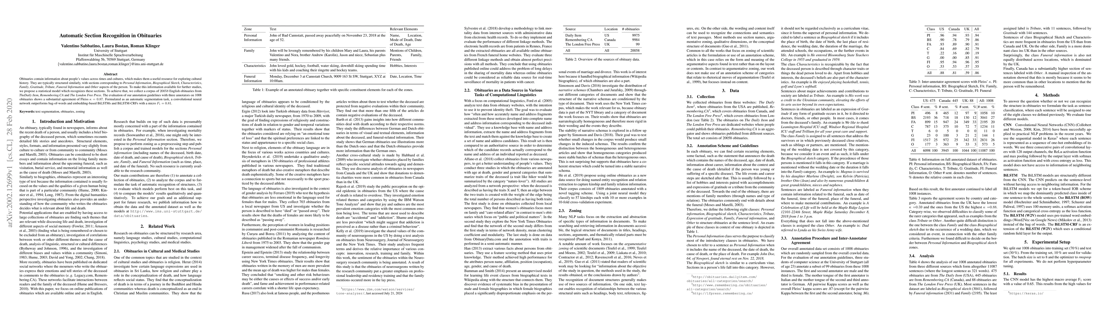 Obituaries contain information about people's values across times and cultures, which makes them a useful resource for exploring cultural history. They are typically structured similarly, with sections corresponding to Personal Information, Biographical Sketch, Characteristics, Family, Gratitude, Tribute, Funeral Information and Other aspects of the person. To make this information available for further studies, we propose a statistical model which recognizes these sections. To achieve that, we collect a corpus of 20058 English obituaries from TheDaily Item, Remembering.CA and The London Free Press. The evaluation of our annotation guidelines with three annotators on 1008 obituaries shows a substantial agreement of Fleiss k = 0.87. Formulated as an automatic segmentation task, a convolutional neural network outperforms bag-of-words and embedding-based BiLSTMs and BiLSTM-CRFs with a micro F1 = 0.81.