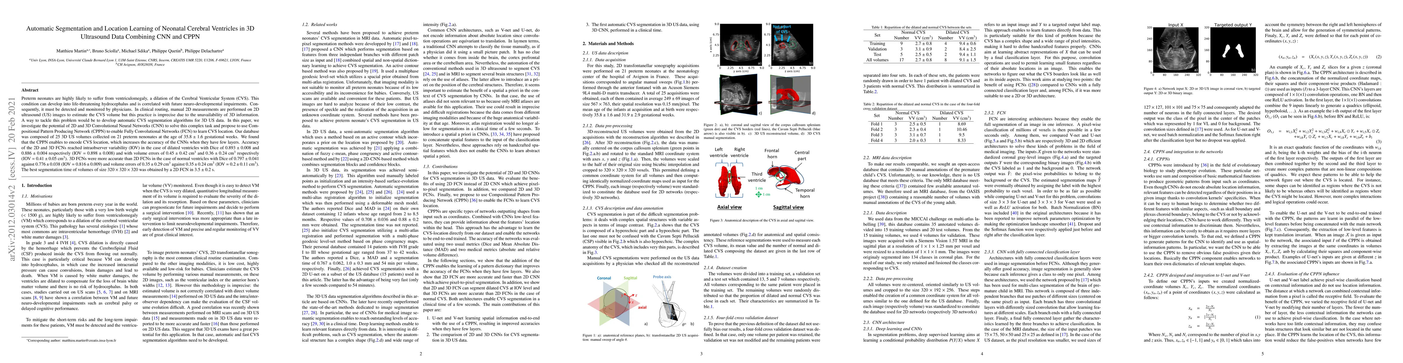 Preterm neonates are highly likely to suffer from ventriculomegaly, a dilation of the Cerebral Ventricular System (CVS). This condition can develop into life-threatening hydrocephalus and is correlated with future neuro-developmental impairments. Consequently, it must be detected and monitored by physicians. In clinical routing, manual 2D measurements are performed on 2D ultrasound (US) images to estimate the CVS volume but this practice is imprecise due to the unavailability of 3D information. A way to tackle this problem would be to develop automatic CVS segmentation algorithms for 3D US data. In this paper, we investigate the potential of 2D and 3D Convolutional Neural Networks (CNN) to solve this complex task and propose to use Compositional Pattern Producing Network (CPPN) to enable the CNNs to learn CVS location. Our database was composed of 25 3D US volumes collected on 21 preterm nenonates at the age of $35.8 \pm 1.6$ gestational weeks. We found that the CPPN enables to encode CVS location, which increases the accuracy of the CNNs when they have few layers. Accuracy of the 2D and 3D CNNs reached intraobserver variability (IOV) in the case of dilated ventricles with Dice of $0.893 \pm 0.008$ and $0.886 \pm 0.004$ respectively (IOV = $0.898 \pm 0.008$) and with volume errors of $0.45 \pm 0.42$ cm$^3$ and $0.36 \pm 0.24$ cm$^3$ respectively (IOV = $0.41 \pm 0.05$ cm$^3$). 3D CNNs were more accurate than 2D CNNs in the case of normal ventricles with Dice of $0.797 \pm 0.041$ against $0.776 \pm 0.038$ (IOV = $0.816 \pm 0.009$) and volume errors of $0.35 \pm 0.29$ cm$^3$ against $0.35 \pm 0.24$ cm$^3$ (IOV = $0.2 \pm 0.11$ cm$^3$). The best segmentation time of volumes of size $320 \times 320 \times 320$ was obtained by a 2D CNN in $3.5 \pm 0.2$ s.