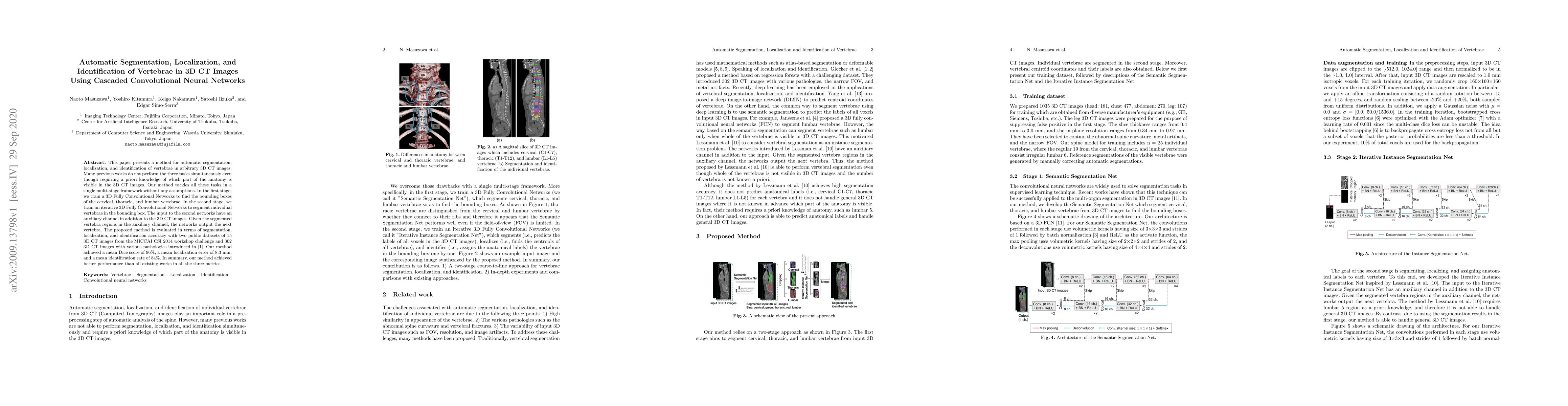 This paper introduces a cascaded convolutional neural network framework for automatic segmentation, localization, and identification of vertebrae in 3D CT images, achieving superior performance with a mean Dice score of 96%, localization error of 8.3 mm, and identification rate of 84%. The method performs all tasks simultaneously without requiring prior anatomical knowledge.