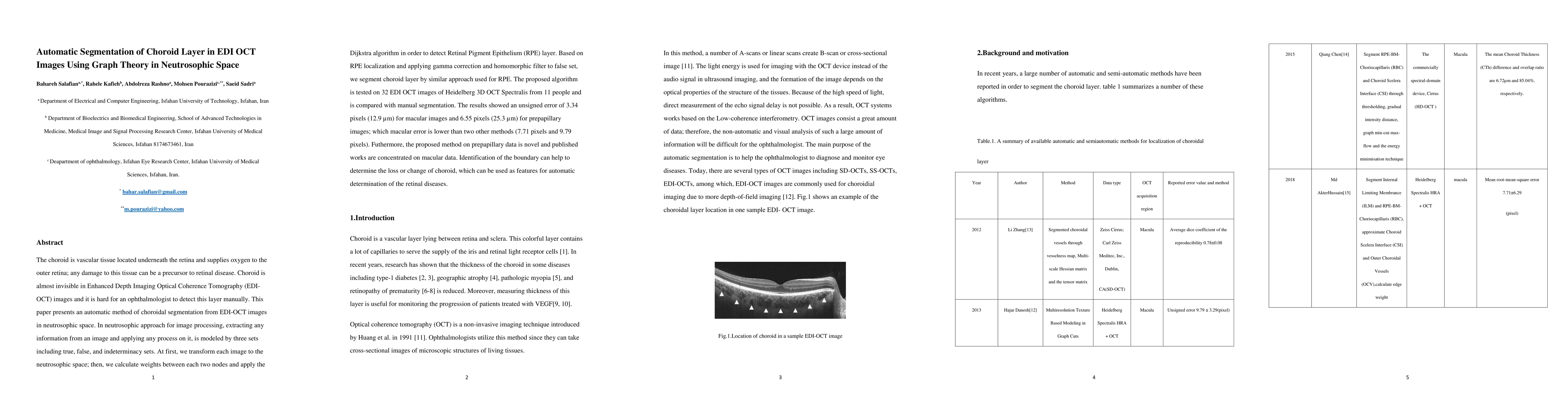 This paper proposes an automatic method for segmenting the choroid layer in Enhanced Depth Imaging Optical Coherence Tomography (EDI OCT) images using graph theory in neutrosophic space. The method localizes the Retinal Pigment Epithelium layer, applies gamma correction and homomorphic filtering, and demonstrates superior accuracy compared to manual segmentation and other methods.