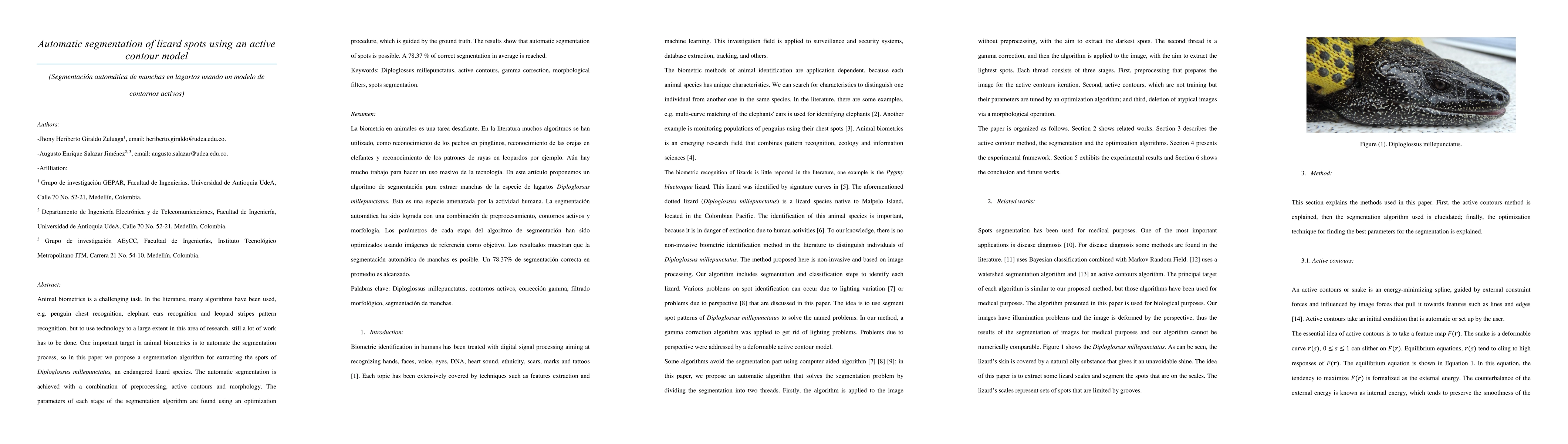 Animal biometrics is a challenging task. In the literature, many algorithms have been used, e.g. penguin chest recognition, elephant ears recognition and leopard stripes pattern recognition, but to use technology to a large extent in this area of research, still a lot of work has to be done. One important target in animal biometrics is to automate the segmentation process, so in this paper we propose a segmentation algorithm for extracting the spots of Diploglossus millepunctatus, an endangered lizard species. The automatic segmentation is achieved with a combination of preprocessing, active contours and morphology. The parameters of each stage of the segmentation algorithm are found using an optimization procedure, which is guided by the ground truth. The results show that automatic segmentation of spots is possible. A 78.37 % of correct segmentation in average is reached.