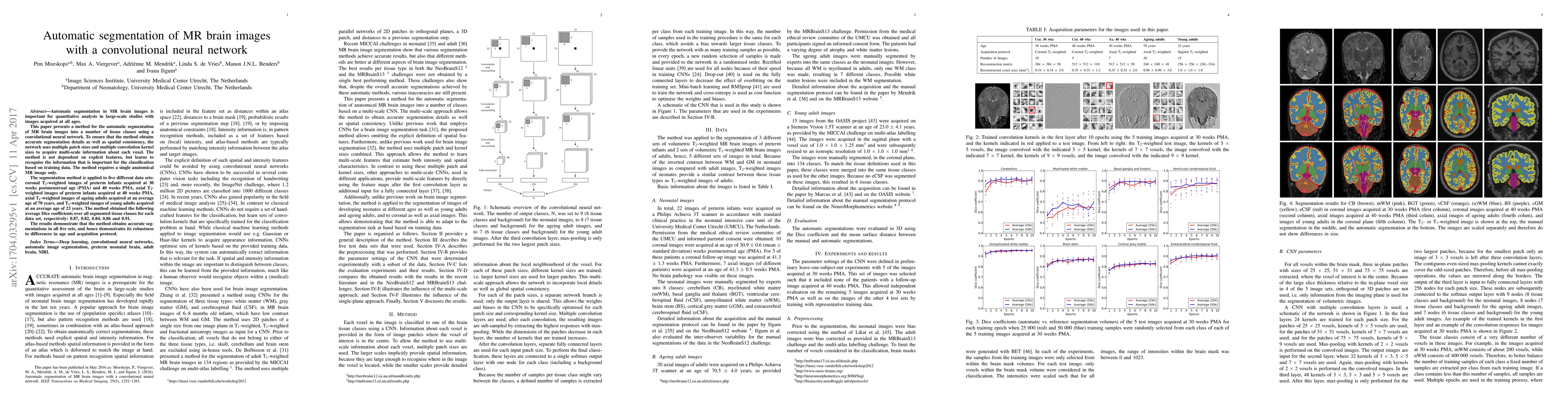 This paper introduces a convolutional neural network for automatic segmentation of MR brain images into tissue classes, utilizing multiple patch sizes and convolution kernel sizes for multi-scale information. The method demonstrates robust performance across diverse age groups and acquisition protocols, achieving average Dice coefficients of 0.87 to 0.91 across five datasets.