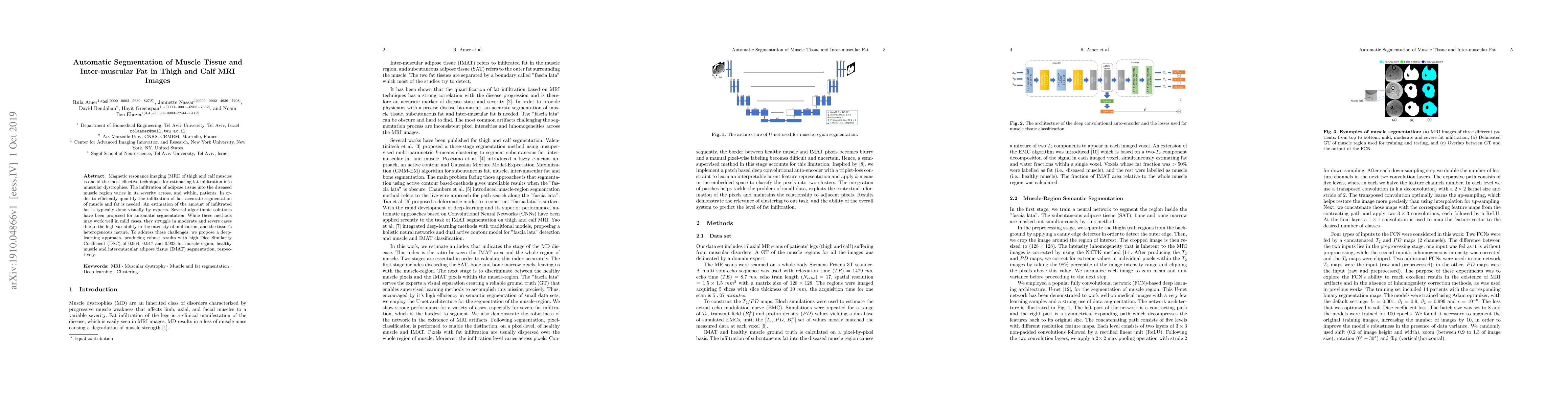 This paper proposes a deep-learning method for automatic segmentation of muscle tissue and inter-muscular fat in thigh and calf MRI images, addressing the challenges of high variability and tissue heterogeneity. The approach achieves high Dice Similarity Coefficients of 0.964, 0.917, and 0.933 for muscle, healthy muscle, and inter-muscular adipose tissue segmentation, respectively.