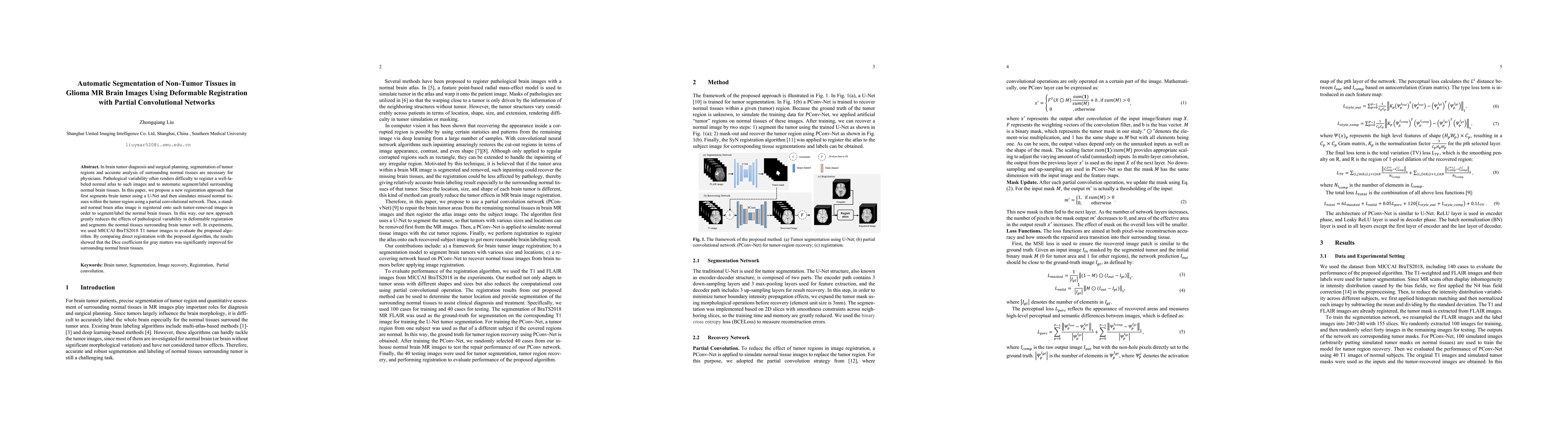 This paper proposes a novel method for segmenting non-tumor tissues in glioma MR brain images using deformable registration with partial convolutional networks. It segments tumors with a U-Net and uses a partial convolutional network to identify normal tissues, improving the Dice coefficient for surrounding gray matters in comparison to direct registration.