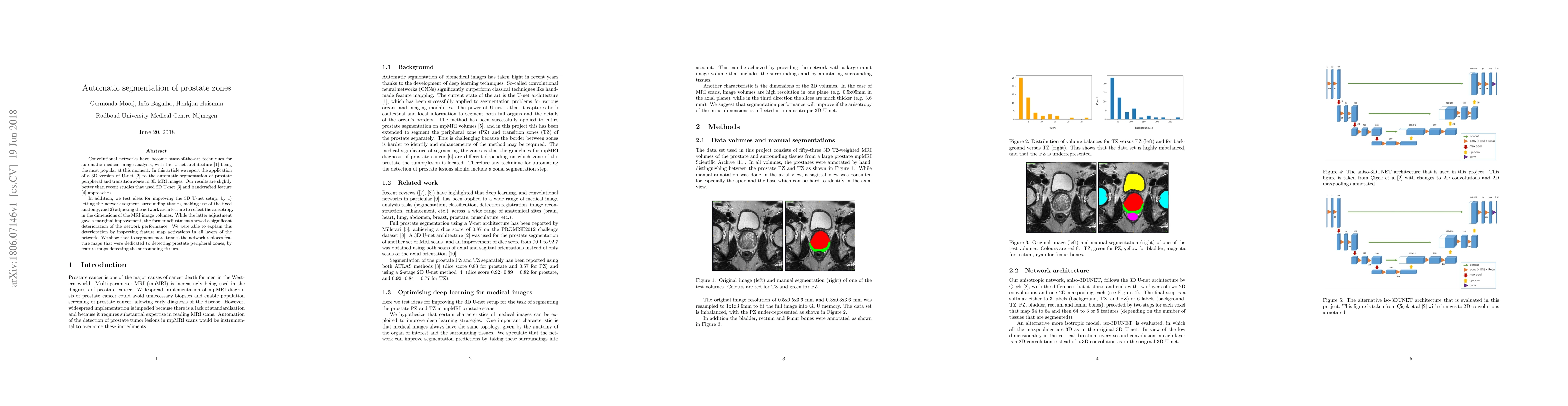 Convolutional networks have become state-of-the-art techniques for automatic medical image analysis, with the U-net architecture being the most popular at this moment. In this article we report the application of a 3D version of U-net to the automatic segmentation of prostate peripheral and transition zones in 3D MRI images. Our results are slightly better than recent studies that used 2D U-net and handcrafted feature approaches. In addition, we test ideas for improving the 3D U-net setup, by 1) letting the network segment surrounding tissues, making use of the fixed anatomy, and 2) adjusting the network architecture to reflect the anisotropy in the dimensions of the MRI image volumes. While the latter adjustment gave a marginal improvement, the former adjustment showed a significant deterioration of the network performance. We were able to explain this deterioration by inspecting feature map activations in all layers of the network. We show that to segment more tissues the network replaces feature maps that were dedicated to detecting prostate peripheral zones, by feature maps detecting the surrounding tissues.