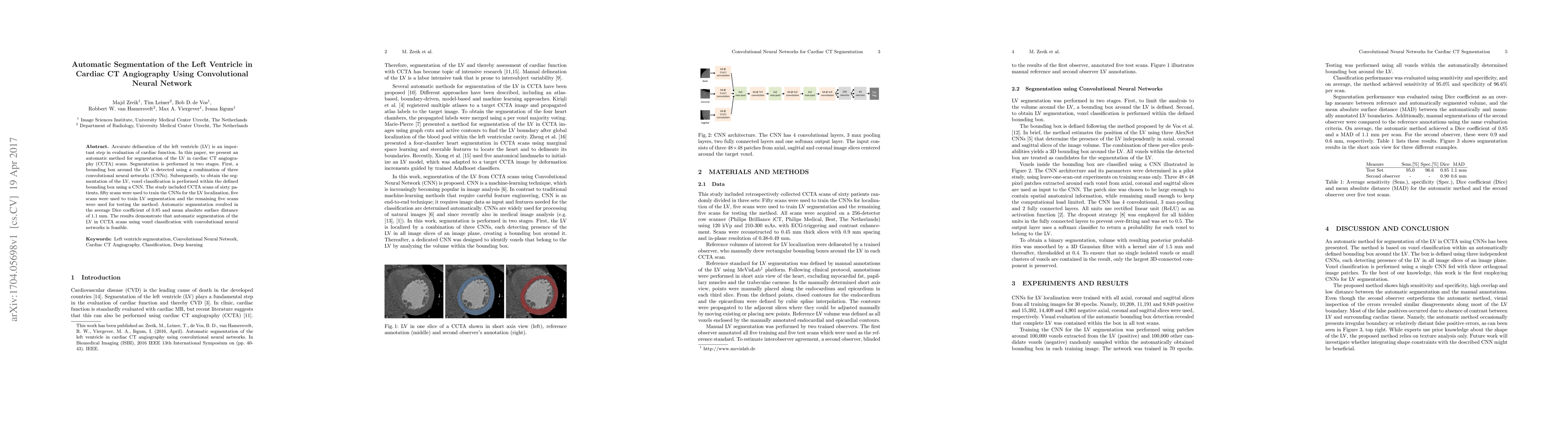 This paper presents an automatic method for segmenting the left ventricle in cardiac CT angiography using convolutional neural networks, achieving an average Dice coefficient of 0.85 and a mean absolute surface distance of 1.1 mm, demonstrating the feasibility of the approach.