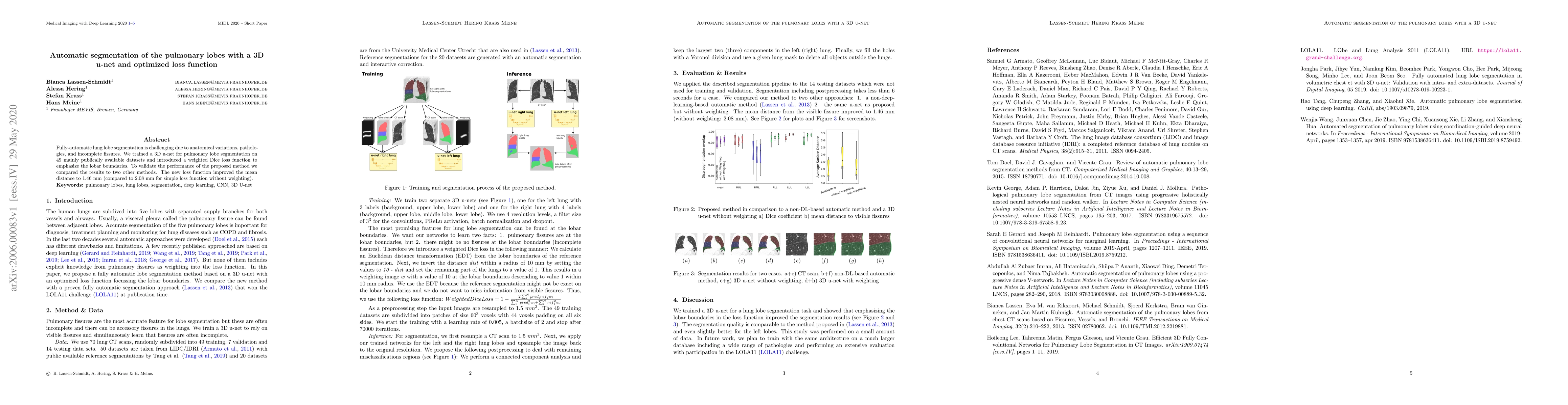 This paper presents a 3D u-net model for automatic segmentation of pulmonary lobes, enhanced with a weighted Dice loss function to better delineate lobar boundaries. The method was validated against other techniques, showing a significant reduction in mean distance error to 1.46 mm compared to 2.08 mm with a standard loss function.