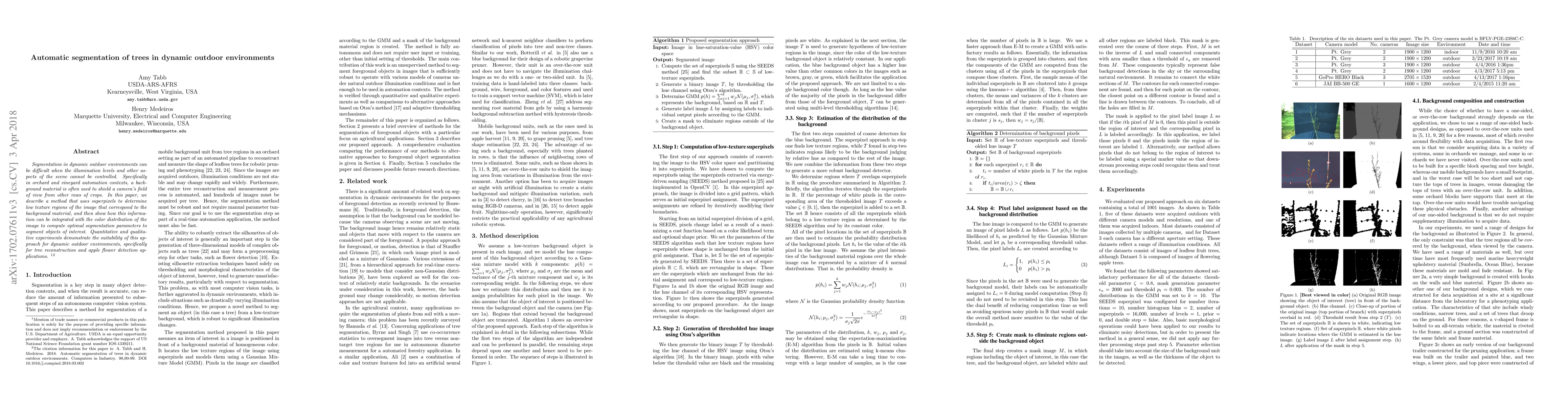 This paper proposes a method for automatic tree segmentation in dynamic outdoor environments using superpixels to identify low texture regions corresponding to background material, integrating this with color distribution for optimal segmentation. Experiments show its effectiveness for tree reconstruction and apple flower detection in orchard and vineyard settings.