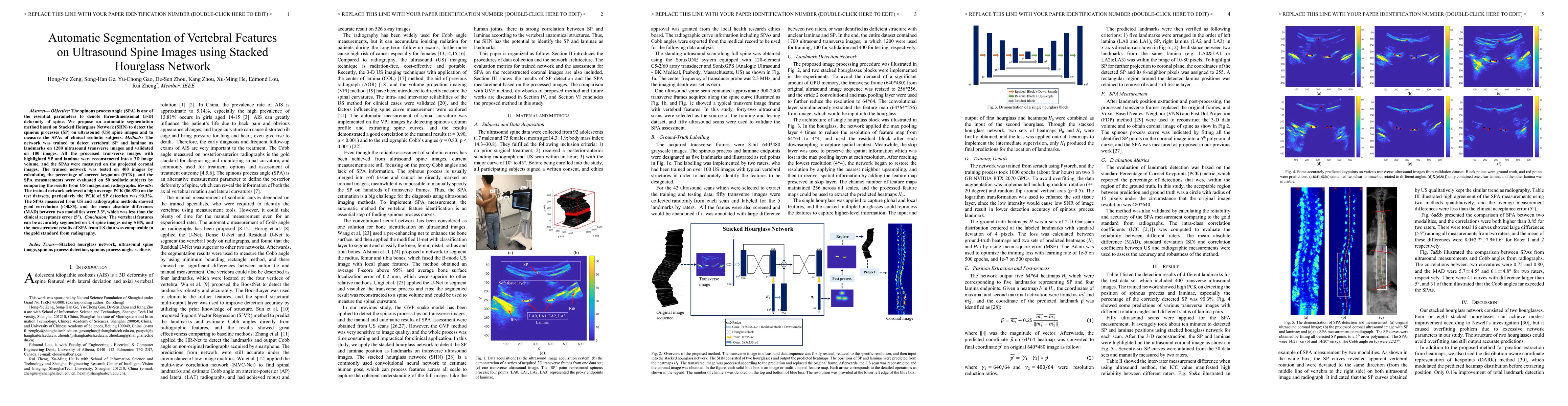 This paper proposes an automatic segmentation method using a Stacked Hourglass Network (SHN) to detect spinous processes on ultrasound spine images, achieving high accuracy in landmark detection and comparable measurements of spinous process angles to radiography. The method shows promising results for assessing 3D spinal deformities in scoliotic subjects.