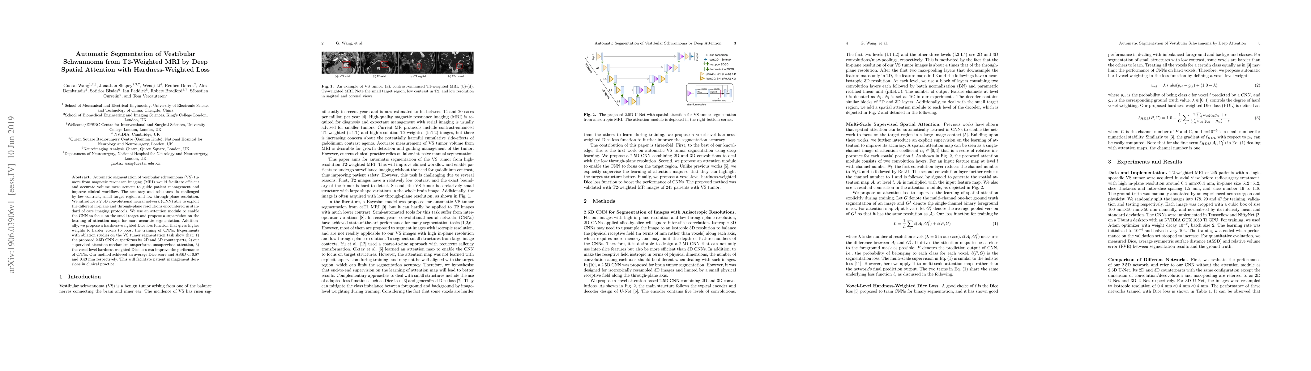 Automatic segmentation of vestibular schwannoma (VS) tumors from magnetic resonance imaging (MRI) would facilitate efficient and accurate volume measurement to guide patient management and improve clinical workflow. The accuracy and robustness is challenged by low contrast, small target region and low through-plane resolution. We introduce a 2.5D convolutional neural network (CNN) able to exploit the different in-plane and through-plane resolutions encountered in standard of care imaging protocols. We use an attention module to enable the CNN to focus on the small target and propose a supervision on the learning of attention maps for more accurate segmentation. Additionally, we propose a hardness-weighted Dice loss function that gives higher weights to harder voxels to boost the training of CNNs. Experiments with ablation studies on the VS tumor segmentation task show that: 1) the proposed 2.5D CNN outperforms its 2D and 3D counterparts, 2) our supervised attention mechanism outperforms unsupervised attention, 3) the voxel-level hardness-weighted Dice loss can improve the performance of CNNs. Our method achieved an average Dice score and ASSD of 0.87 and 0.43~mm respectively. This will facilitate patient management decisions in clinical practice.