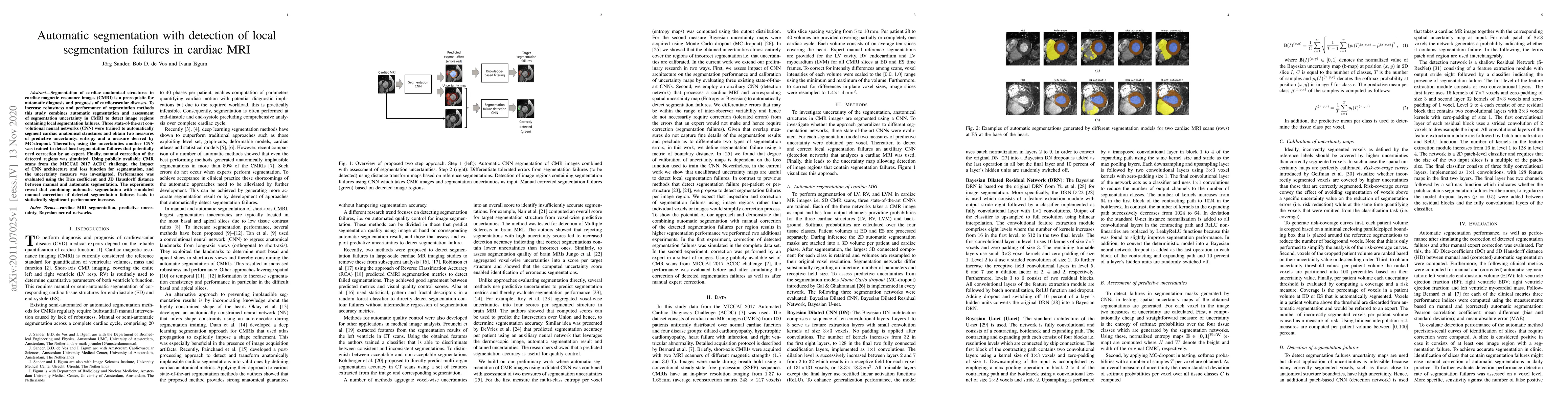 Segmentation of cardiac anatomical structures in cardiac magnetic resonance images (CMRI) is a prerequisite for automatic diagnosis and prognosis of cardiovascular diseases. To increase robustness and performance of segmentation methods this study combines automatic segmentation and assessment of segmentation uncertainty in CMRI to detect image regions containing local segmentation failures. Three state-of-the-art convolutional neural networks (CNN) were trained to automatically segment cardiac anatomical structures and obtain two measures of predictive uncertainty: entropy and a measure derived by MC-dropout. Thereafter, using the uncertainties another CNN was trained to detect local segmentation failures that potentially need correction by an expert. Finally, manual correction of the detected regions was simulated. Using publicly available CMR scans from the MICCAI 2017 ACDC challenge, the impact of CNN architecture and loss function for segmentation, and the uncertainty measure was investigated. Performance was evaluated using the Dice coefficient and 3D Hausdorff distance between manual and automatic segmentation. The experiments reveal that combining automatic segmentation with simulated manual correction of detected segmentation failures leads to statistically significant performance increase.