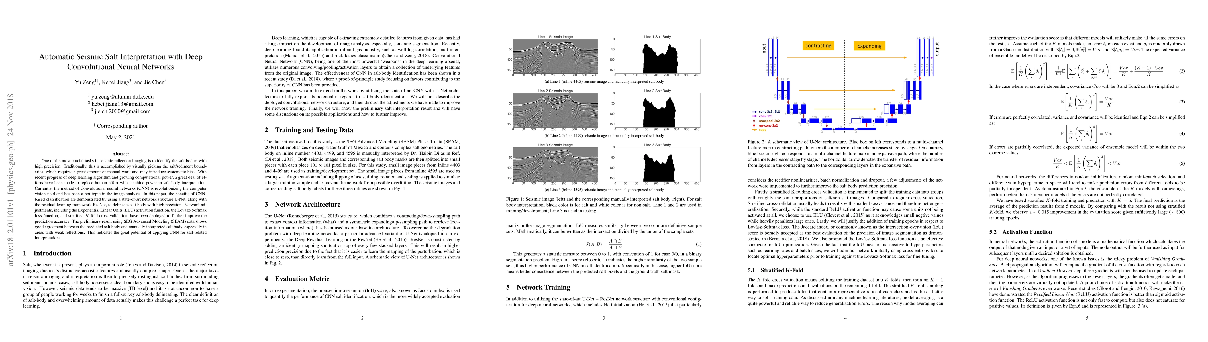 This research paper explores the use of deep convolutional neural networks, specifically U-Net and ResNet, to automate the interpretation of seismic salt bodies. The study demonstrates improved precision over traditional manual methods, showing promising results in areas with weak reflections, suggesting a significant advancement in seismic reflection imaging.