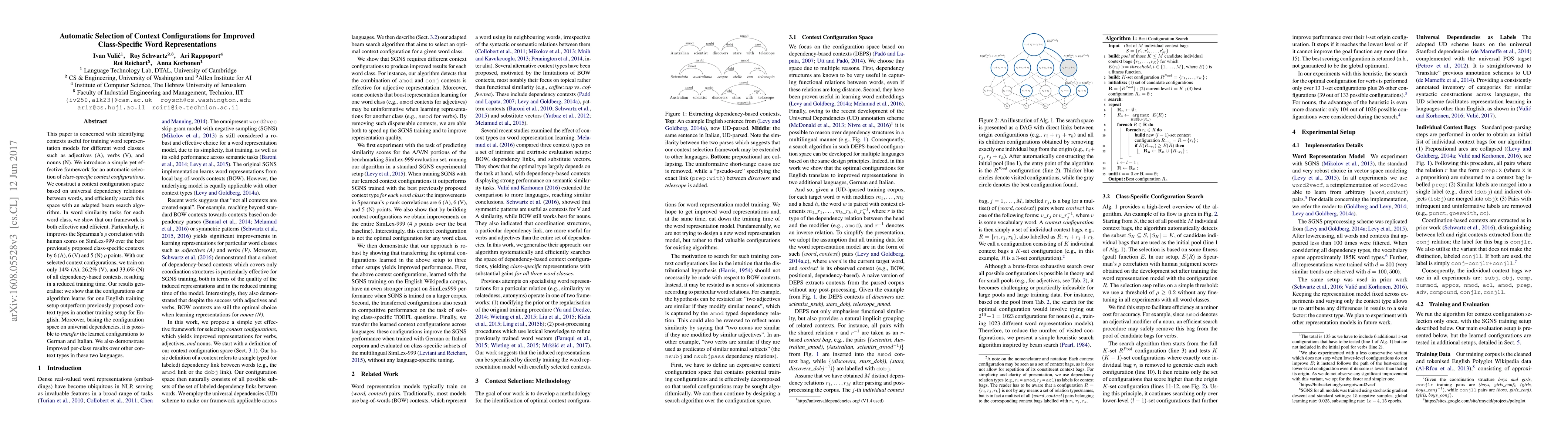 This paper proposes a framework for automatically selecting optimal context configurations for training class-specific word representations, achieving better word similarity correlations with human judgments. The method efficiently searches a context configuration space based on universal dependency relations, leading to improved performance and reduced training time.