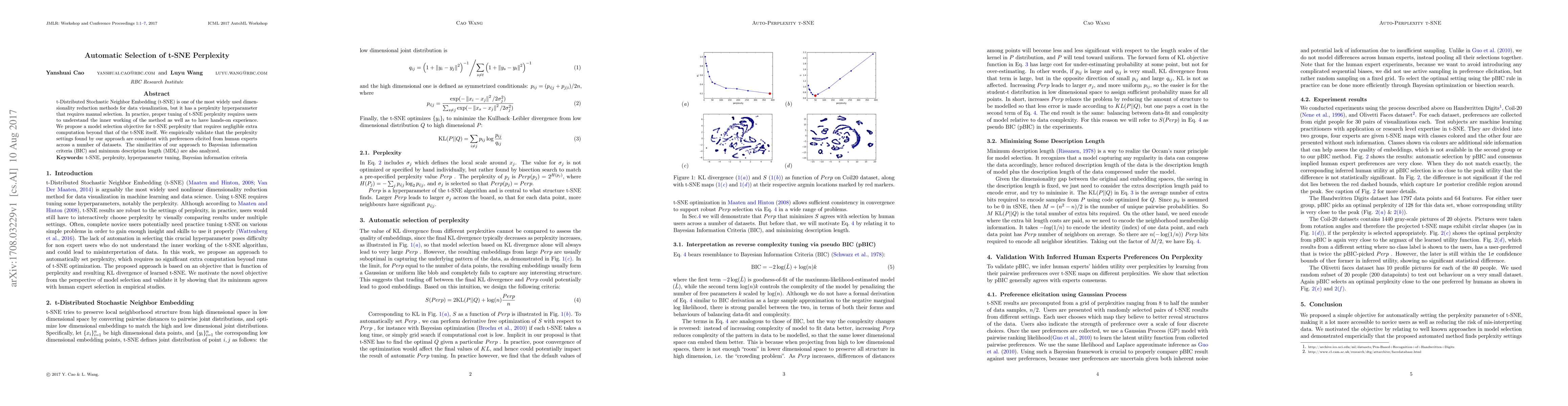 This paper proposes an automated method for selecting the t-SNE perplexity hyperparameter with minimal additional computational cost, validated against expert human preferences. The approach is shown to be comparable to Bayesian information criteria and minimum description length principles.
