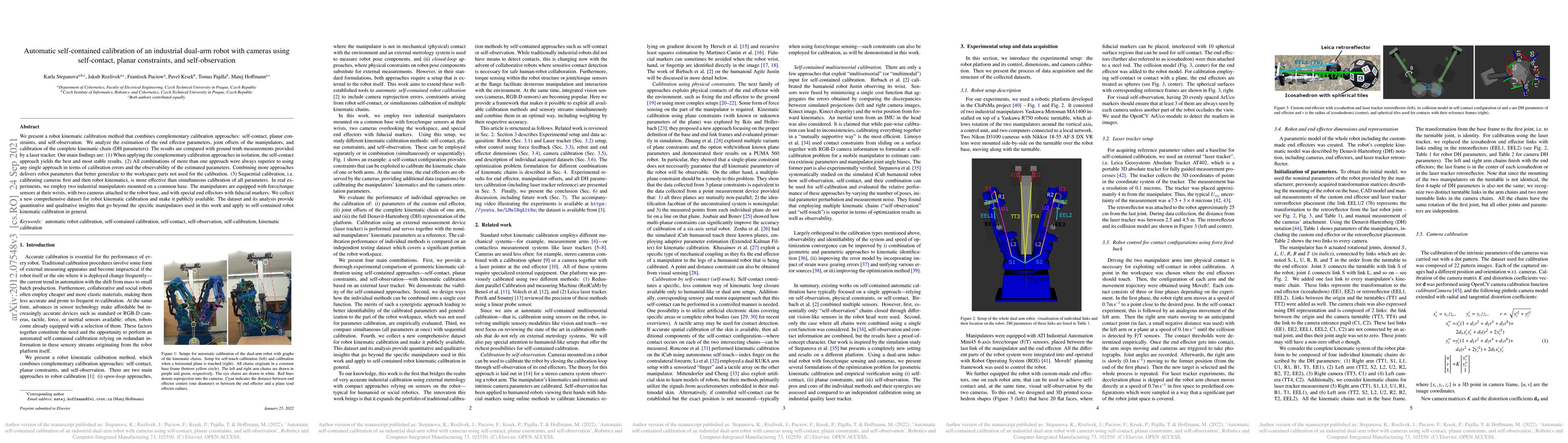This research introduces a novel calibration method for dual-arm industrial robots using self-contact, planar constraints, and self-observation, showing that combining these approaches yields better results than any single method. Sequential calibration of cameras followed by robot kinematics was found to be more effective than simultaneous calibration, leading to improved generalization across the robot's workspace.