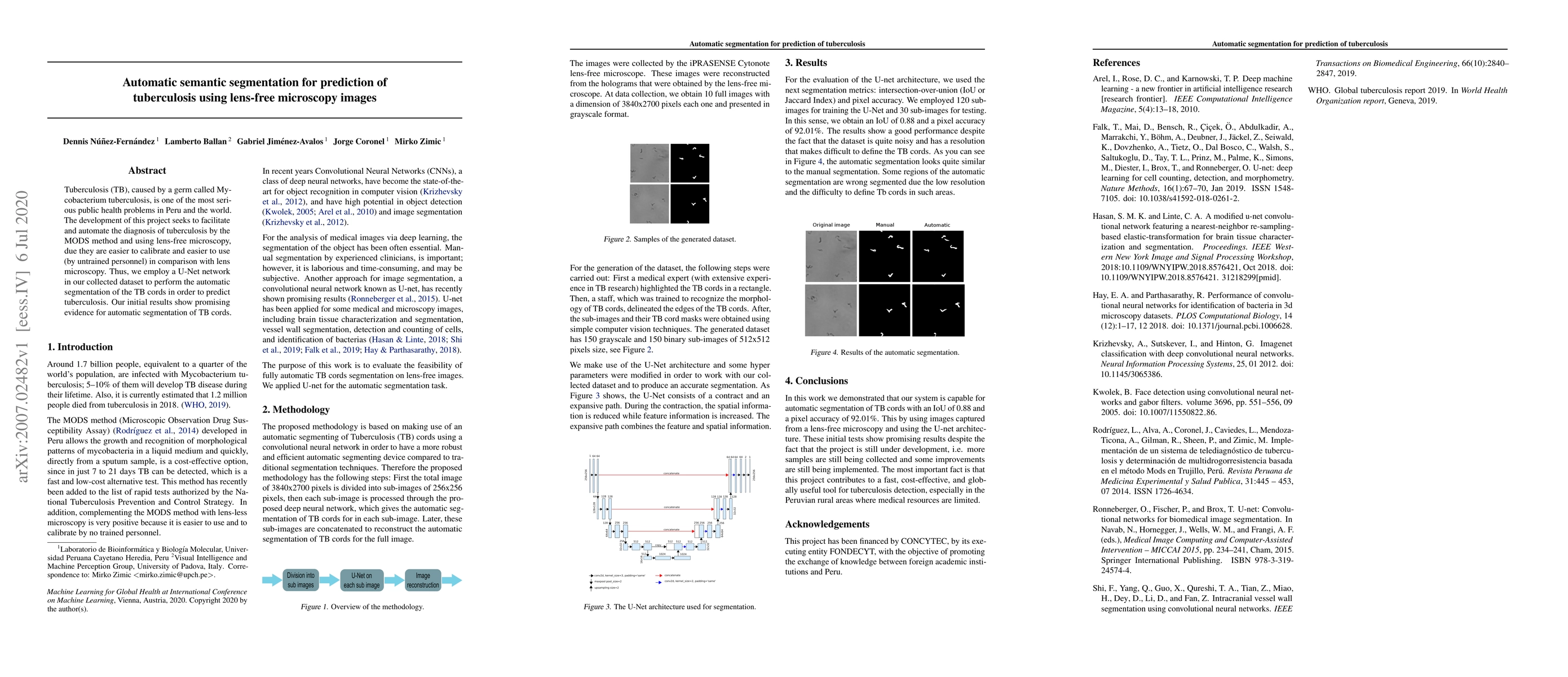 Tuberculosis (TB), caused by a germ called Mycobacterium tuberculosis, is one of the most serious public health problems in Peru and the world. The development of this project seeks to facilitate and automate the diagnosis of tuberculosis by the MODS method and using lens-free microscopy, due they are easier to calibrate and easier to use (by untrained personnel) in comparison with lens microscopy. Thus, we employ a U-Net network in our collected dataset to perform the automatic segmentation of the TB cords in order to predict tuberculosis. Our initial results show promising evidence for automatic segmentation of TB cords.