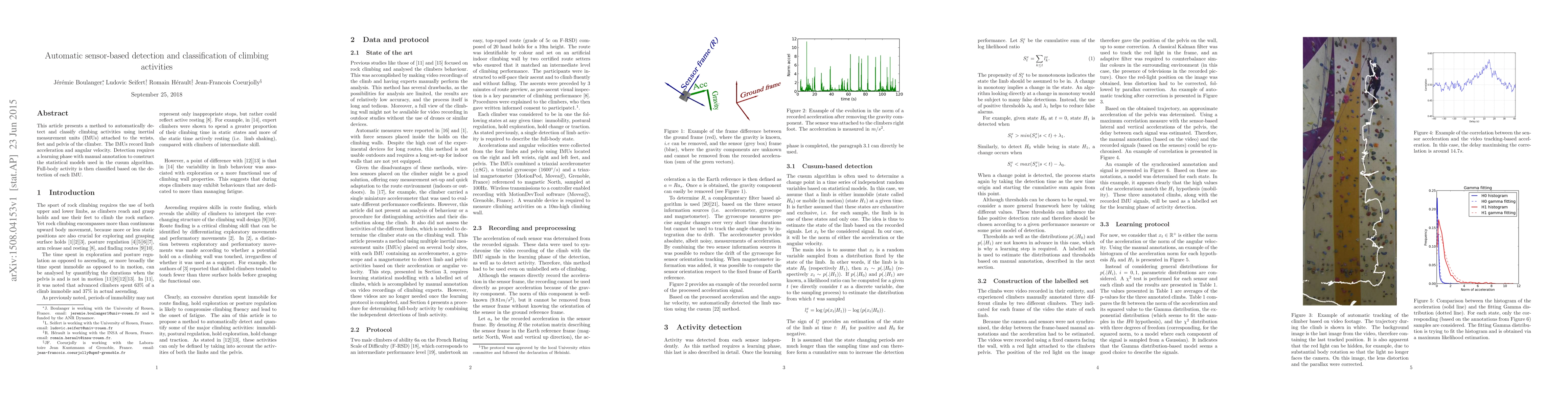 This article presents a method to automatically detect and classify climbing activities using inertial measurement units (IMUs) attached to the wrists, feet and pelvis of the climber. The IMUs record limb acceleration and angular velocity. Detection requires a learning phase with manual annotation to construct the statistical models used in the cusum algorithm. Full-body activity is then classified based on the detection of each IMU.