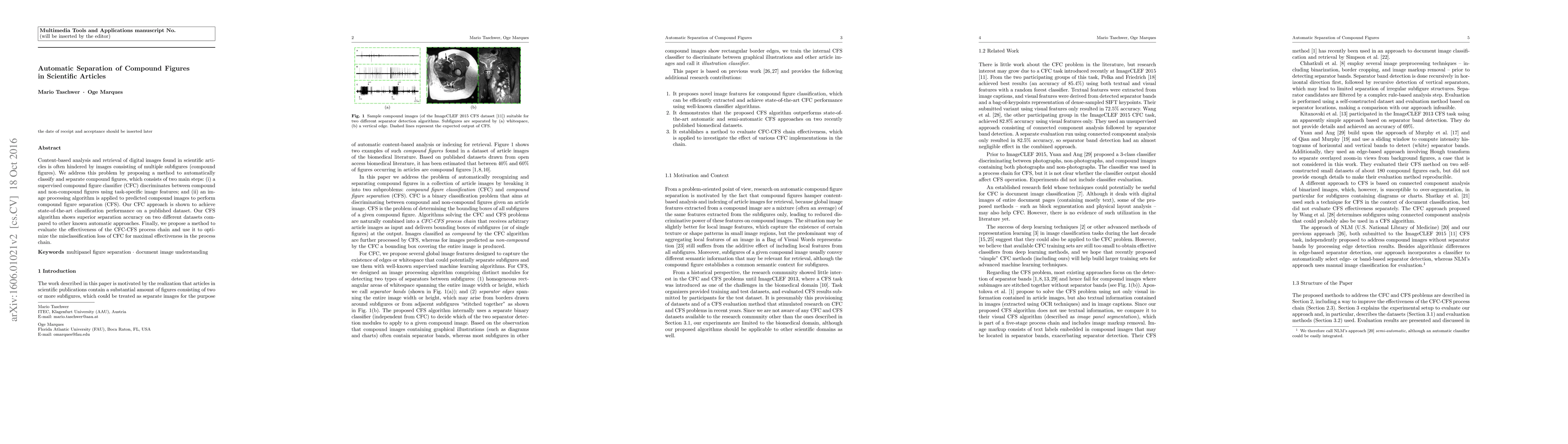 This paper proposes an automatic method to classify and separate compound figures in scientific articles, using a supervised classifier and an image processing algorithm. The method achieves state-of-the-art classification and superior separation accuracy compared to existing approaches, and includes an optimization technique to enhance overall effectiveness.