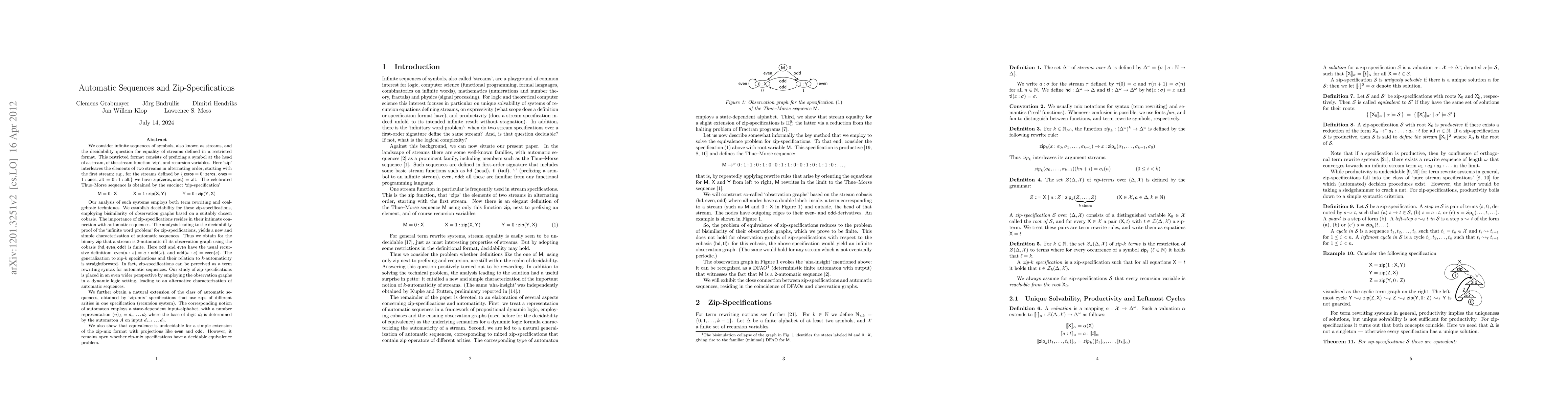 We consider infinite sequences of symbols, also known as streams, and the decidability question for equality of streams defined in a restricted format. This restricted format consists of prefixing a symbol at the head of a stream, of the stream function `zip', and recursion variables. Here `zip' interleaves the elements of two streams in alternating order, starting with the first stream. For example, the Thue-Morse sequence is obtained by the `zip-specification' {M = 0 : X, X = 1 : zip(X,Y), Y = 0 : zip(Y,X)}. Our analysis of such systems employs both term rewriting and coalgebraic techniques. We establish decidability for these zip-specifications, employing bisimilarity of observation graphs based on a suitably chosen cobasis. The importance of zip-specifications resides in their intimate connection with automatic sequences. We establish a new and simple characterization of automatic sequences. Thus we obtain for the binary zip that a stream is 2-automatic iff its observation graph using the cobasis (hd,even,odd) is finite. The generalization to zip-k specifications and their relation to k-automaticity is straightforward. In fact, zip-specifications can be perceived as a term rewriting syntax for automatic sequences. Our study of zip-specifications is placed in an even wider perspective by employing the observation graphs in a dynamic logic setting, leading to an alternative characterization of automatic sequences. We further obtain a natural extension of the class of automatic sequences, obtained by `zip-mix' specifications that use zips of different arities in one specification. We also show that equivalence is undecidable for a simple extension of the zip-mix format with projections like even and odd. However, it remains open whether zip-mix specifications have a decidable equivalence problem.
