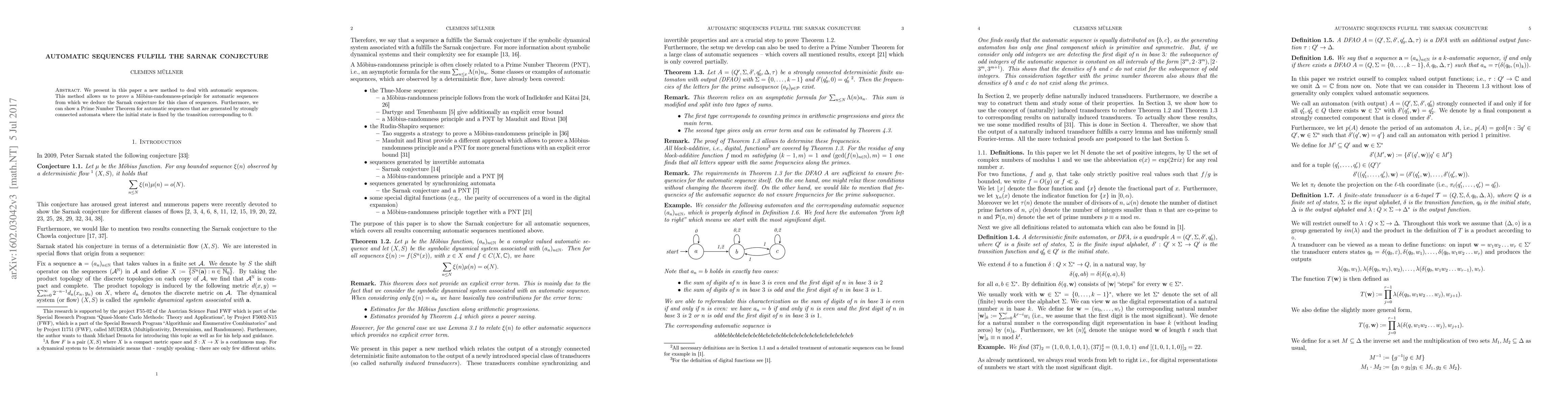 This paper introduces a new method for handling automatic sequences, proving a M\"obius-randomness principle that leads to the Sarnak conjecture for these sequences. Additionally, it demonstrates a Prime Number Theorem for automatic sequences generated by strongly connected automata.