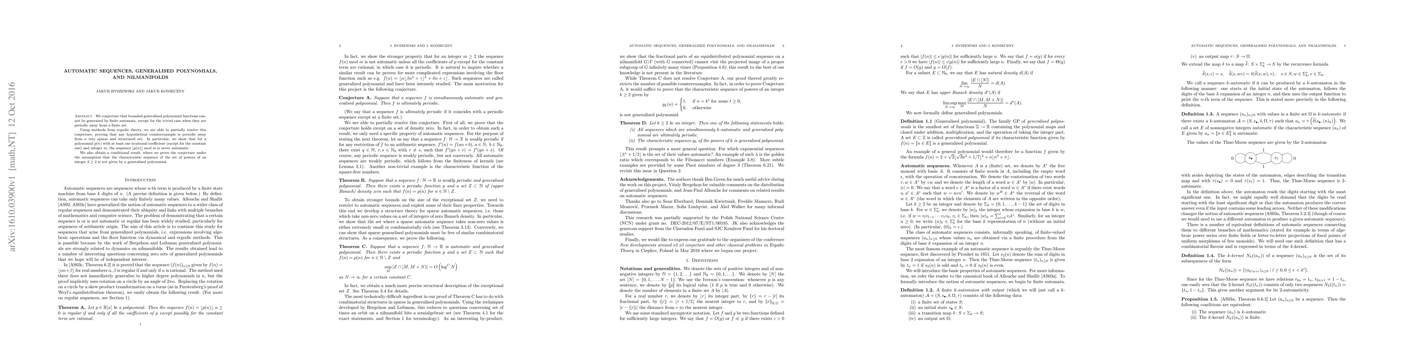 This paper conjectures that bounded generalised polynomial functions cannot be generated by finite automata, except for periodic functions away from a finite set. Using ergodic theory, the authors prove that any counterexample would be periodic away from a sparse set, and show that certain polynomial sequences with irrational coefficients are never automatic.