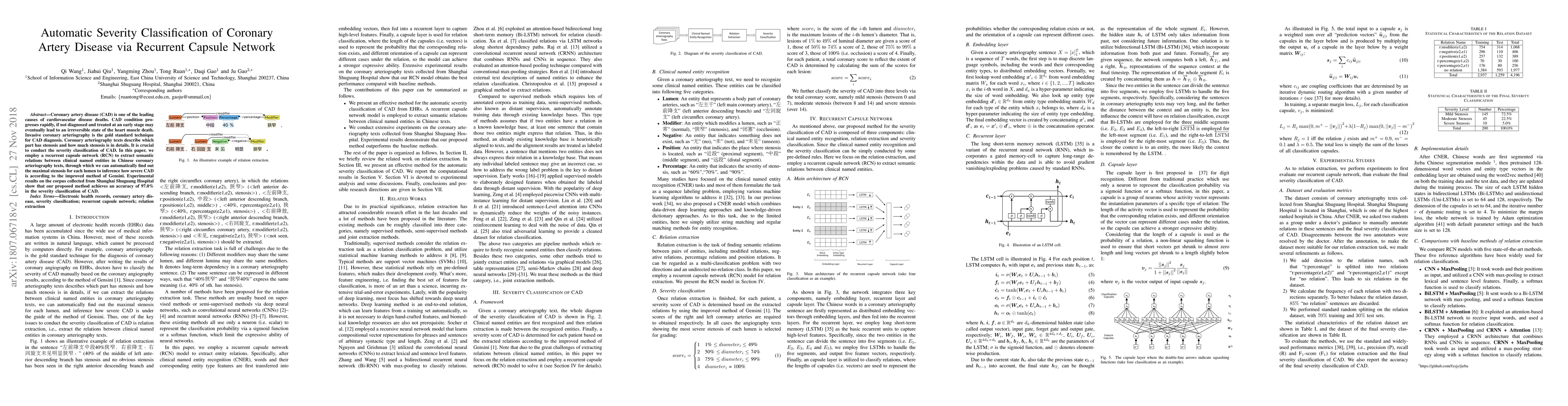 This research employs a Recurrent Capsule Network (RCN) to extract semantic relations between clinical named entities in Chinese coronary arteriography texts for automatic CAD severity classification.