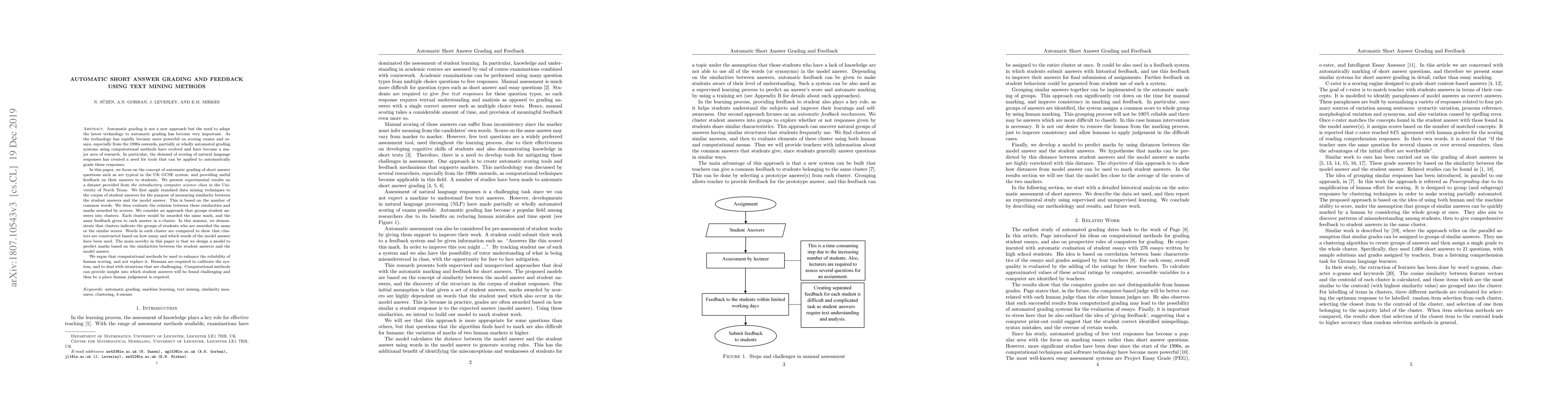 This paper explores automatic grading of short answer questions using text mining, focusing on the UK GCSE system. It proposes a method to cluster student answers based on word similarity to a model answer, demonstrating how clusters correlate with awarded marks and providing feedback to students.