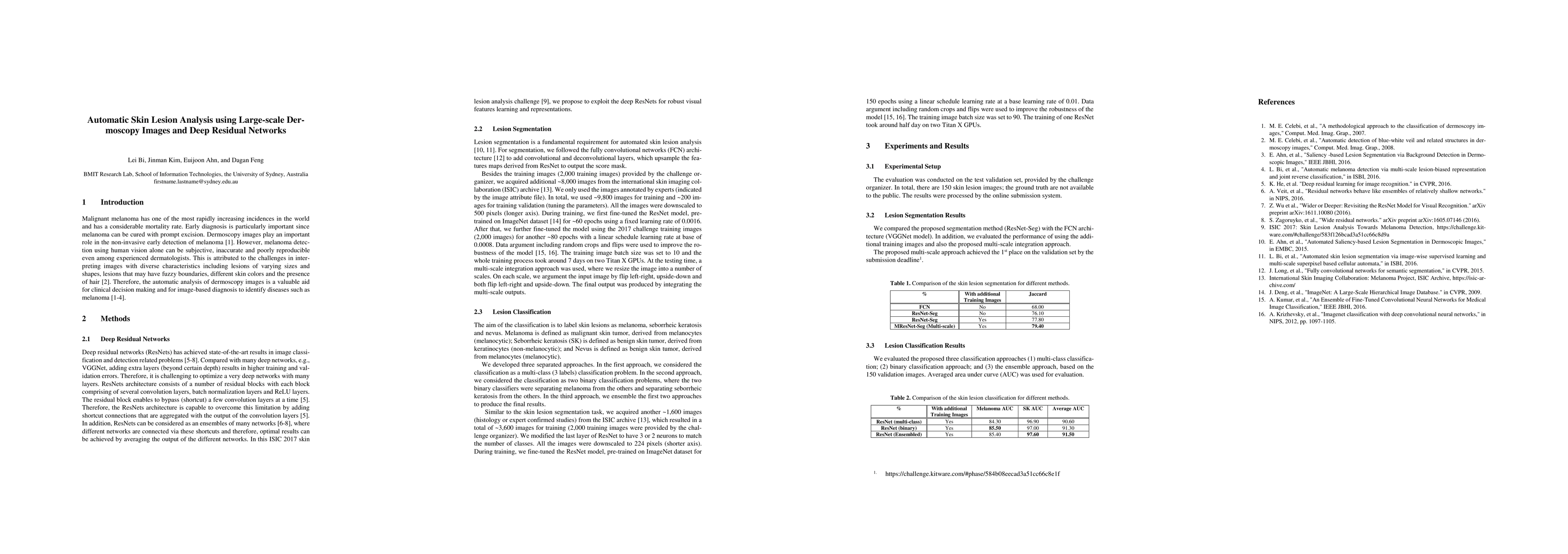 Malignant melanoma has one of the most rapidly increasing incidences in the world and has a considerable mortality rate. Early diagnosis is particularly important since melanoma can be cured with prompt excision. Dermoscopy images play an important role in the non-invasive early detection of melanoma [1]. However, melanoma detection using human vision alone can be subjective, inaccurate and poorly reproducible even among experienced dermatologists. This is attributed to the challenges in interpreting images with diverse characteristics including lesions of varying sizes and shapes, lesions that may have fuzzy boundaries, different skin colors and the presence of hair [2]. Therefore, the automatic analysis of dermoscopy images is a valuable aid for clinical decision making and for image-based diagnosis to identify diseases such as melanoma [1-4]. Deep residual networks (ResNets) has achieved state-of-the-art results in image classification and detection related problems [5-8]. In this ISIC 2017 skin lesion analysis challenge [9], we propose to exploit the deep ResNets for robust visual features learning and representations.