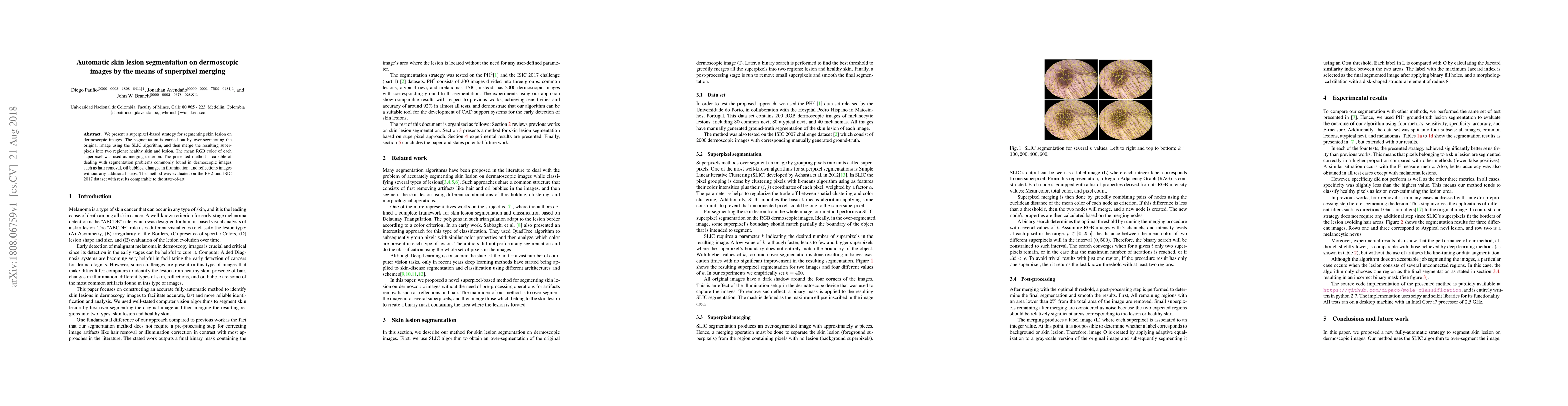 This paper proposes a superpixel-based method for segmenting skin lesions in dermoscopic images using the SLIC algorithm for initial over-segmentation and merging based on mean RGB color, achieving results comparable to the state-of-the-art on PH2 and ISIC 2017 datasets. The method effectively handles common segmentation challenges like hair removal and illumination changes.