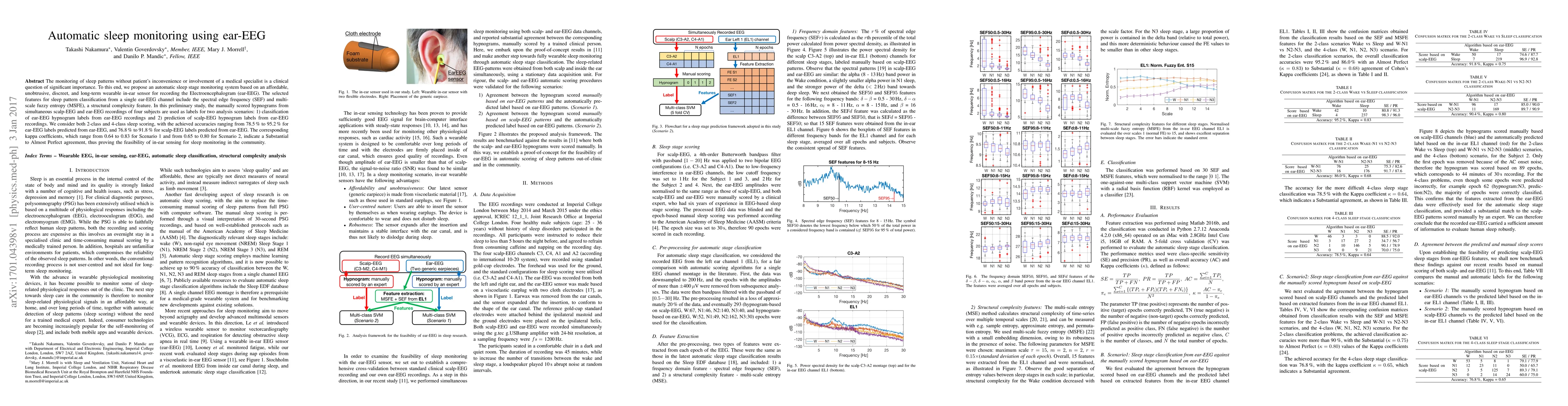 This study proposes an automatic sleep stage monitoring system using an in-ear EEG sensor (ear-EEG) for non-invasive, long-term sleep pattern tracking. The system achieves high accuracy (78.5% to 95.2%) in classifying sleep stages, demonstrating substantial to almost perfect agreement with scalp-EEG, indicating the potential of ear-EEG for community-based sleep monitoring.