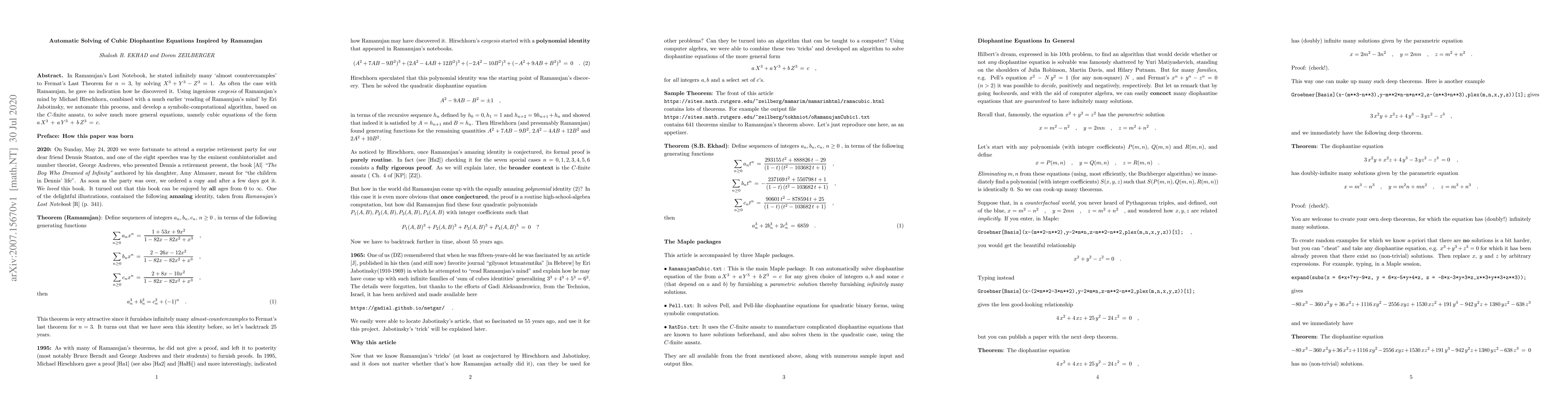 In Ramanujan's Lost Notebook there is an amazing identity that furnishes infinitely many "almost counterexamples" to the cubic Fermat's Last Theorem, with no indication whatsoever how he discovered it. In 1995, Michael Hirschhorn explained, in a brilliant way, how Ramanujan may have done it, based on a certain polynomial identity for a sum of four cubes. Much earlier, Eri Jabotinsky, in an article published in 1946 (in a mathematics journal for teenagers) explained how Ramanujan may have discovered these polynomial identities needed for Hirschhorn's approach. Here we combine these two brilliant ideas (that may or may not have been how Ramanujan did it), automate it, and generalize, by developing an algorithm to solve a large class of cubic diophantine equations. Our interest in this problem was rekindled after reading Amy Alznauer's (b. Andrews) delightful children book "The Boy Who Dreamed of Infinity" (Candlewick Press), 2020, where Ramanujan's identity appears in one of the illustrations.