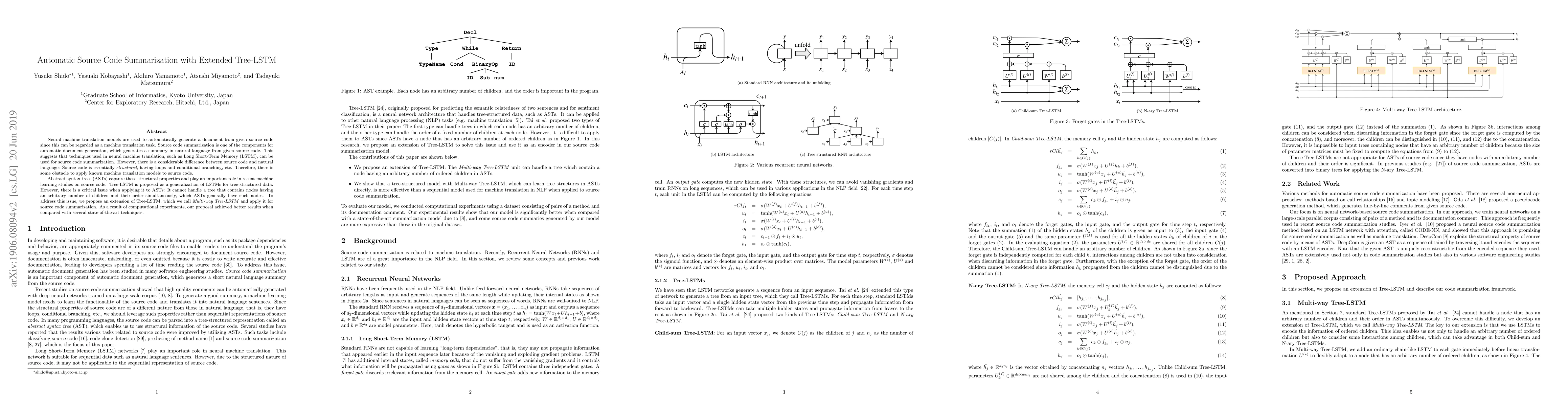This paper proposes an extended Tree-LSTM model called Multi-way Tree-LSTM to address the limitations of standard Tree-LSTMs for source code summarization. The new model successfully handles the structured nature of ASTs, resulting in better summarization performance compared to state-of-the-art techniques.