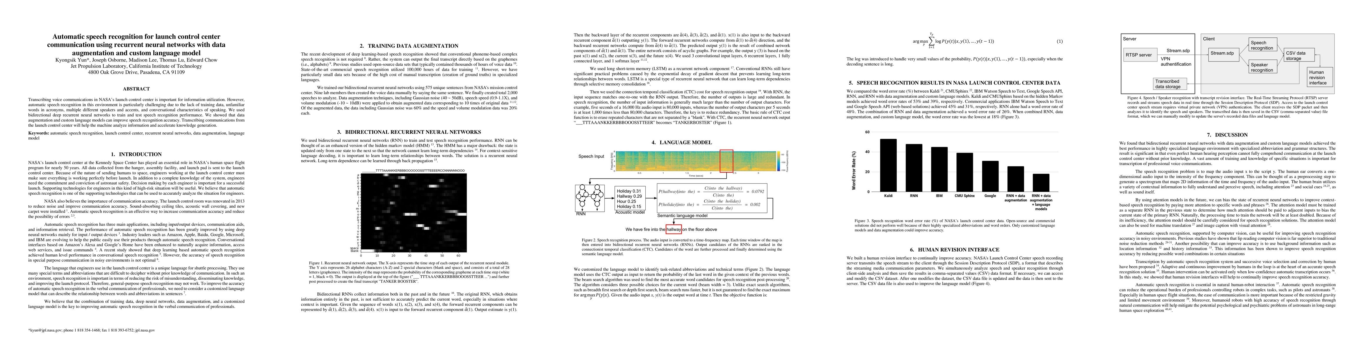 Transcribing voice communications in NASA's launch control center is important for information utilization. However, automatic speech recognition in this environment is particularly challenging due to the lack of training data, unfamiliar words in acronyms, multiple different speakers and accents, and conversational characteristics of speaking. We used bidirectional deep recurrent neural networks to train and test speech recognition performance. We showed that data augmentation and custom language models can improve speech recognition accuracy. Transcribing communications from the launch control center will help the machine analyze information and accelerate knowledge generation.