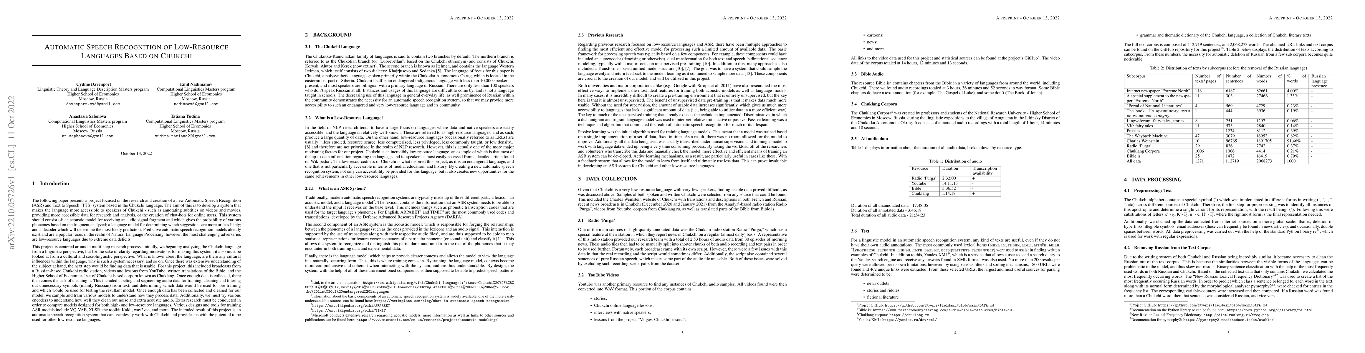 The following paper presents a project focused on the research and creation of a new Automatic Speech Recognition (ASR) based in the Chukchi language. There is no one complete corpus of the Chukchi language, so most of the work consisted in collecting audio and texts in the Chukchi language from open sources and processing them. We managed to collect 21:34:23 hours of audio recordings and 112,719 sentences (or 2,068,273 words) of text in the Chukchi language. The XLSR model was trained on the obtained data, which showed good results even with a small amount of data. Besides the fact that the Chukchi language is a low-resource language, it is also polysynthetic, which significantly complicates any automatic processing. Thus, the usual WER metric for evaluating ASR becomes less indicative for a polysynthetic language. However, the CER metric showed good results. The question of metrics for polysynthetic languages remains open.