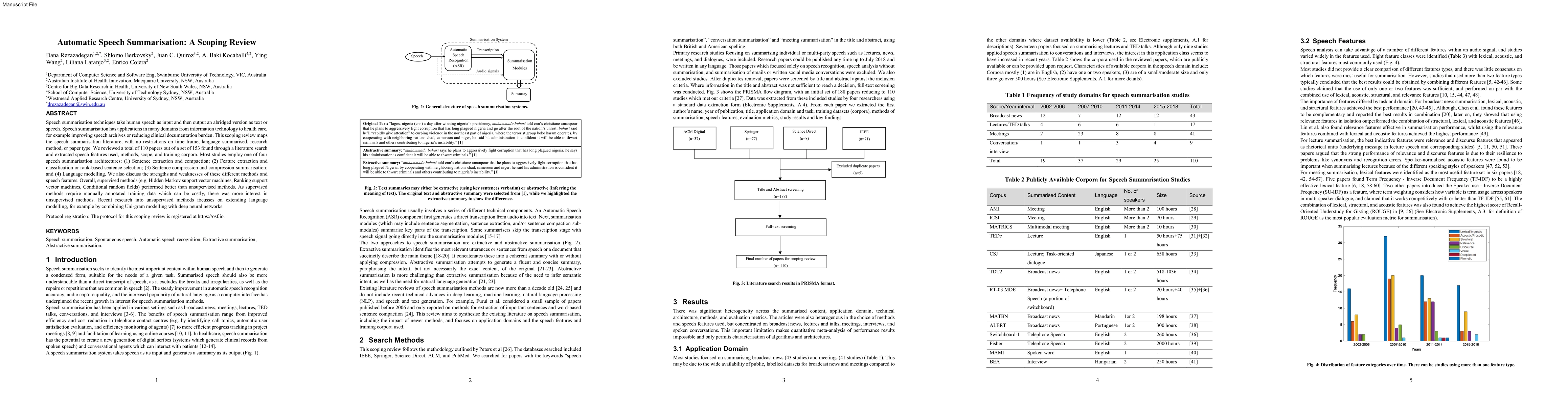 This scoping review examines 110 papers on automatic speech summarisation techniques, identifying four main architectures and discussing their strengths and weaknesses. Supervised methods generally outperform unsupervised ones, though the latter is gaining interest due to cost-effectiveness.