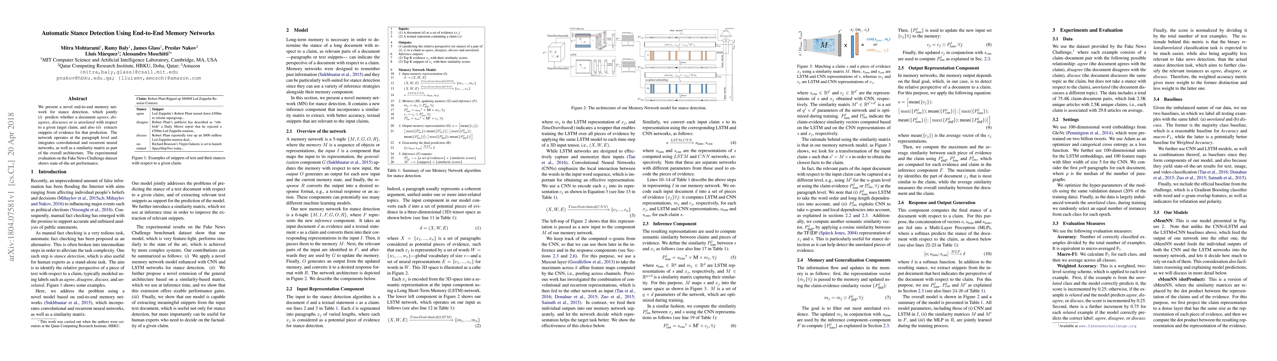 This paper introduces an end-to-end memory network for stance detection, achieving state-of-the-art performance on the Fake News Challenge dataset by predicting document stances and extracting relevant evidence snippets. The architecture combines convolutional and recurrent neural networks with a similarity matrix.