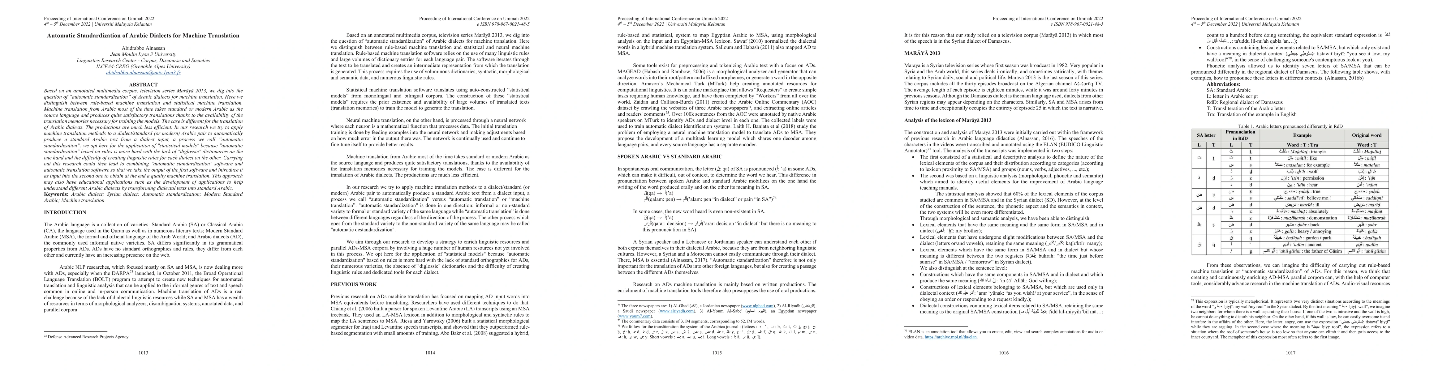 This paper explores automatic standardization of Arabic dialects for machine translation using statistical models, focusing on converting dialectal texts into standard Arabic to improve translation efficiency and educational applications. The research aims to integrate this standardization with automatic translation software for enhanced machine translation quality.
