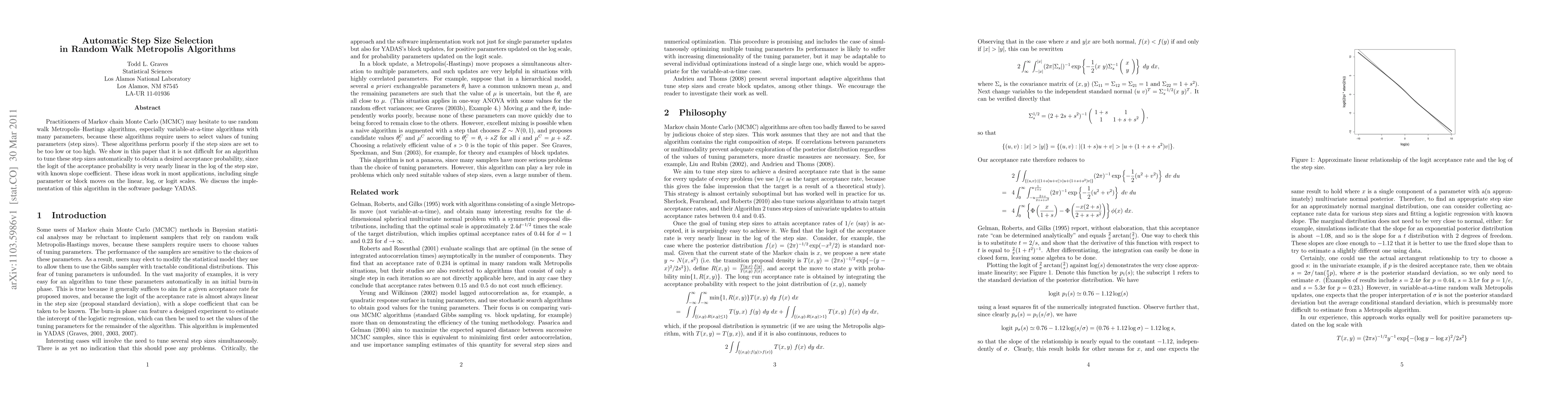 This paper proposes an automatic step size selection method for Random Walk Metropolis-Hastings algorithms to improve performance by tuning step sizes to achieve desired acceptance probabilities. The method leverages the linear relationship between the logit of acceptance probability and the log of the step size, implemented in the software package YADAS.
