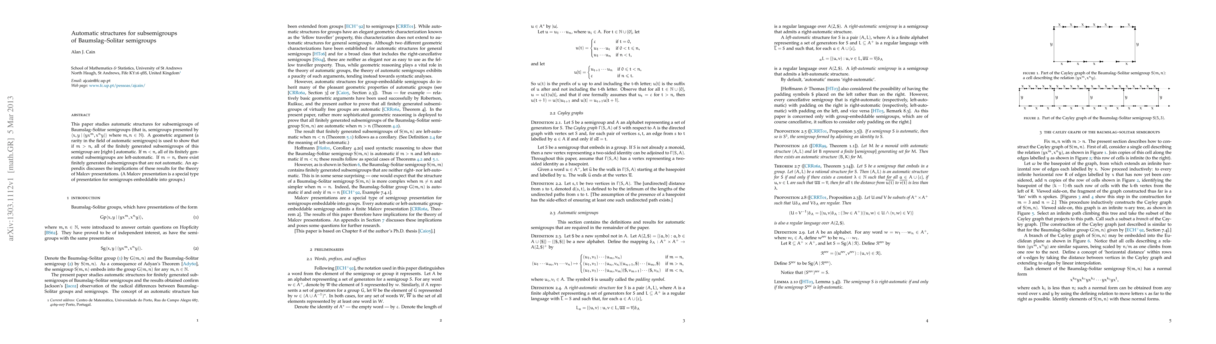 This paper demonstrates that finitely generated subsemigroups of Baumslag-Solitar semigroups are automatic when $m > n$ and left-automatic when $m < n$, with non-automatic cases arising when $m = n$. The results have implications for the theory of Malcev presentations.