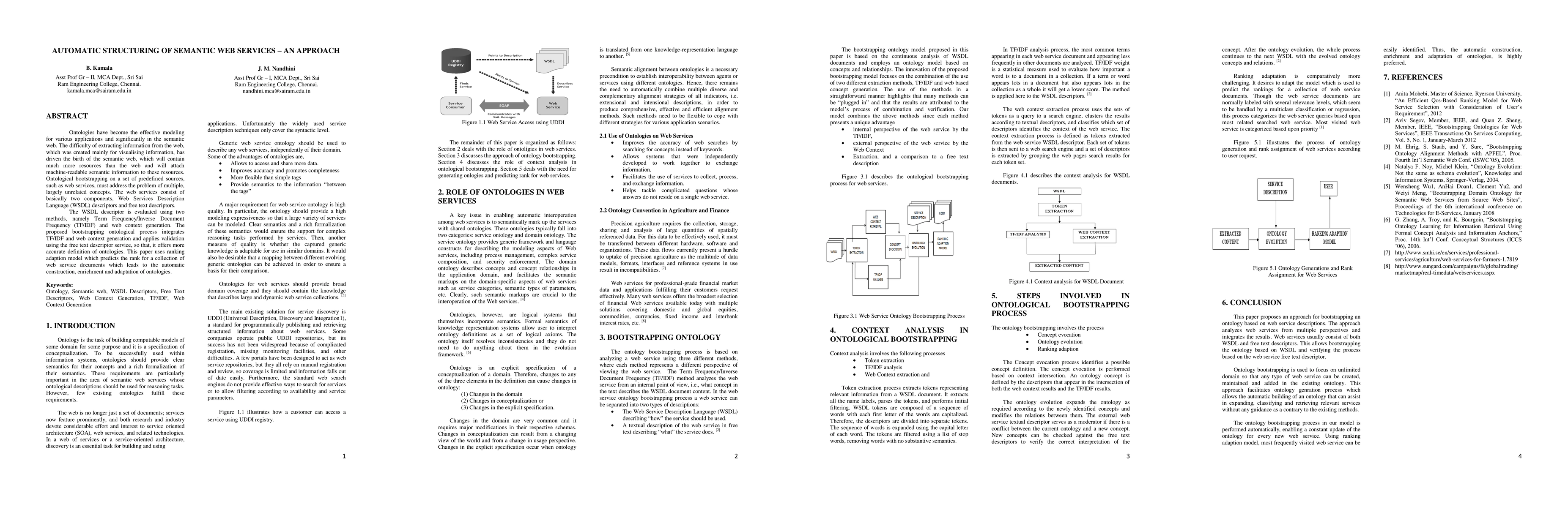 This paper proposes an approach for automatic structuring of semantic web services using ontological bootstrapping. It integrates TF/IDF and web context generation to evaluate WSDL descriptors, enhancing the accuracy of ontology definitions through validation with free text descriptors and a ranking adaptation model.
