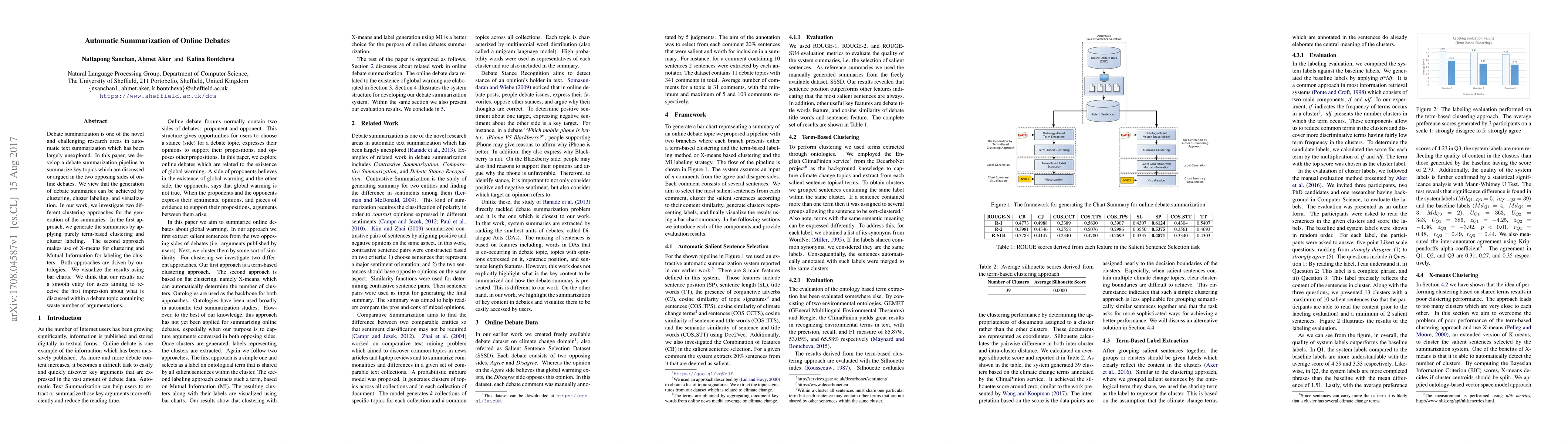 This paper develops a pipeline for automatic summarization of online debates, employing term-based clustering and X-means clustering with Mutual Information labeling, both driven by ontologies. The results are visualized via bar charts to provide users with a concise overview of key topics discussed in the debates.