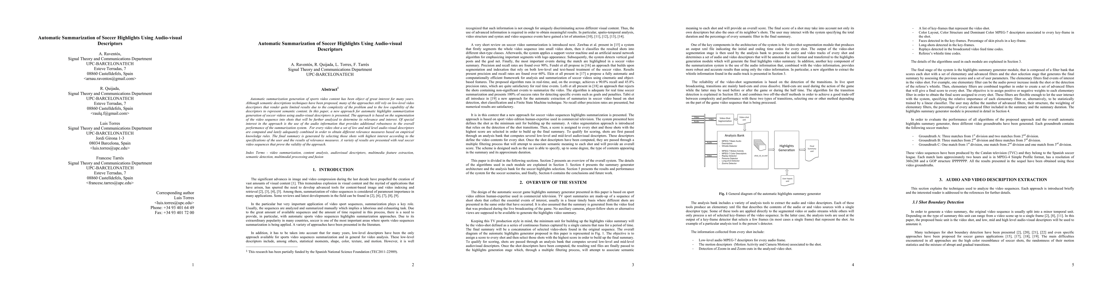 This paper proposes an automatic summarization method for soccer videos using audio-visual descriptors, segmenting videos into shots and computing low and mid-level descriptors to determine relevance. The inclusion of audio information enhances robustness, and the final summary selects the most interesting shots based on user specifications and relevance measures.