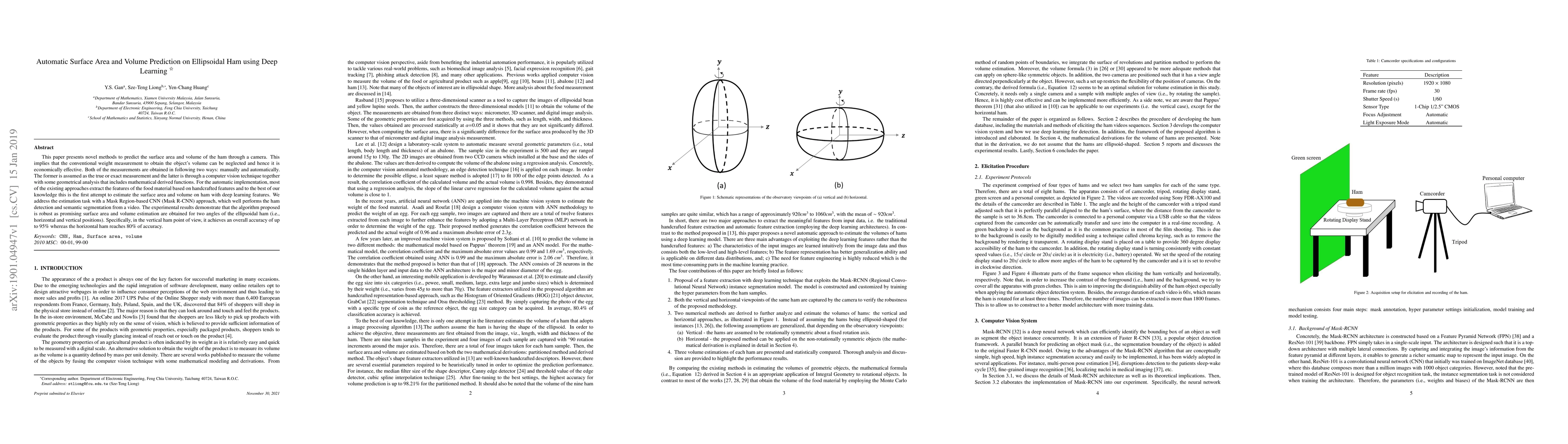 This paper presents novel methods to predict the surface and volume of the ham through a camera. This implies that the conventional weight measurement to obtain in the object's volume can be neglected and hence it is economically effective. Both of the measurements are obtained in the following two ways: manually and automatically. The former is assume as the true or exact measurement and the latter is through a computer vision technique with some geometrical analysis that includes mathematical derived functions. For the automatic implementation, most of the existing approaches extract the features of the food material based on handcrafted features and to the best of our knowledge this is the first attempt to estimate the surface area and volume on ham with deep learning features. We address the estimation task with a Mask Region-based CNN (Mask R-CNN) approach, which well performs the ham detection and semantic segmentation from a video. The experimental results demonstrate that the algorithm proposed is robust as promising surface area and volume estimation are obtained for two angles of the ellipsoidal ham (i.e., horizontal and vertical positions). Specifically, in the vertical ham point of view, it achieves an overall accuracy up to 95% whereas the horizontal ham reaches 80% of accuracy.