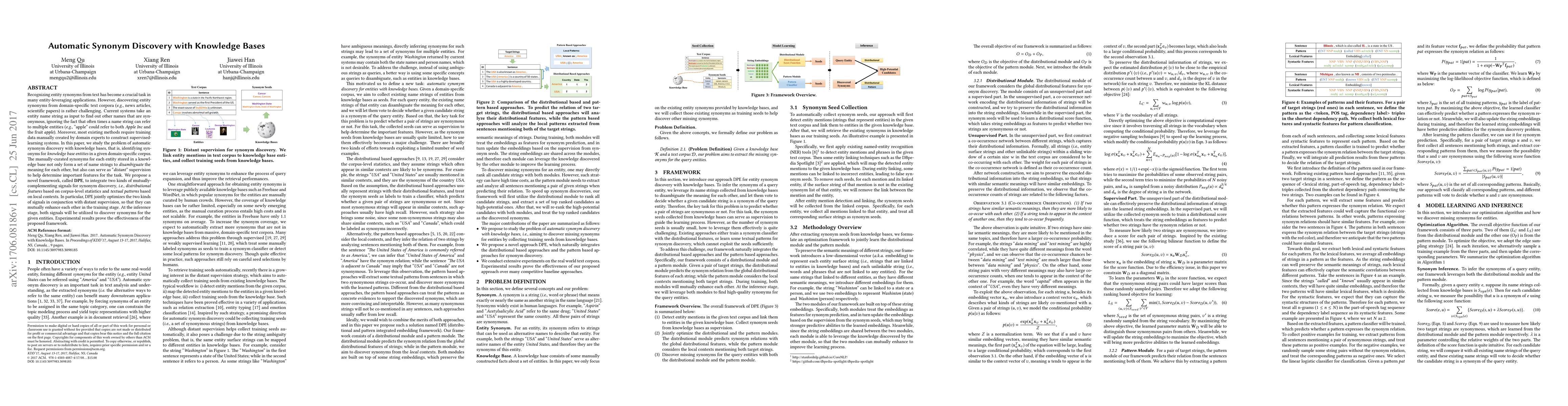 This paper proposes a framework called DPE for automatic synonym discovery using knowledge bases, integrating distributional features and textual patterns to identify synonyms in domain-specific corpora. The method leverages distant supervision from manually-curated knowledge bases to enhance feature determination and synonym discovery.