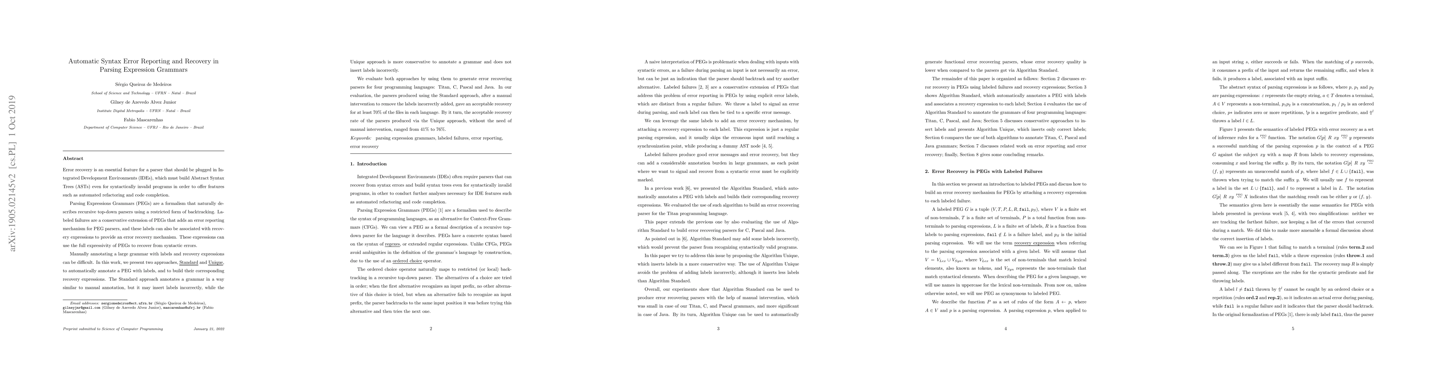 Error recovery is an essential feature for a parser that should be plugged in Integrated Development Environments (IDEs), which must build Abstract Syntax Trees (ASTs) even for syntactically invalid programs in order to offer features such as automated refactoring and code completion. Parsing Expressions Grammars (PEGs) are a formalism that naturally describes recursive top-down parsers using a restricted form of backtracking. Labeled failures are a conservative extension of PEGs that adds an error reporting mechanism for PEG parsers, and these labels can also be associated with recovery expressions to provide an error recovery mechanism. These expressions can use the full expressivity of PEGs to recover from syntactic errors. Manually annotating a large grammar with labels and recovery expressions can be difficult. In this work, we present two approaches, Standard and Unique, to automatically annotate a PEG with labels, and to build their corresponding recovery expressions. The Standard approach annotates a grammar in a way similar to manual annotation, but it may insert labels incorrectly, while the Unique approach is more conservative to annotate a grammar and does not insert labels incorrectly. We evaluate both approaches by using them to generate error recovering parsers for four programming languages: Titan, C, Pascal and Java. In our evaluation, the parsers produced using the Standard approach, after a manual intervention to remove the labels incorrectly added, gave an acceptable recovery for at least 70% of the files in each language. By it turn, the acceptable recovery rate of the parsers produced via the Unique approach, without the need of manual intervention, ranged from 41% to 76%.