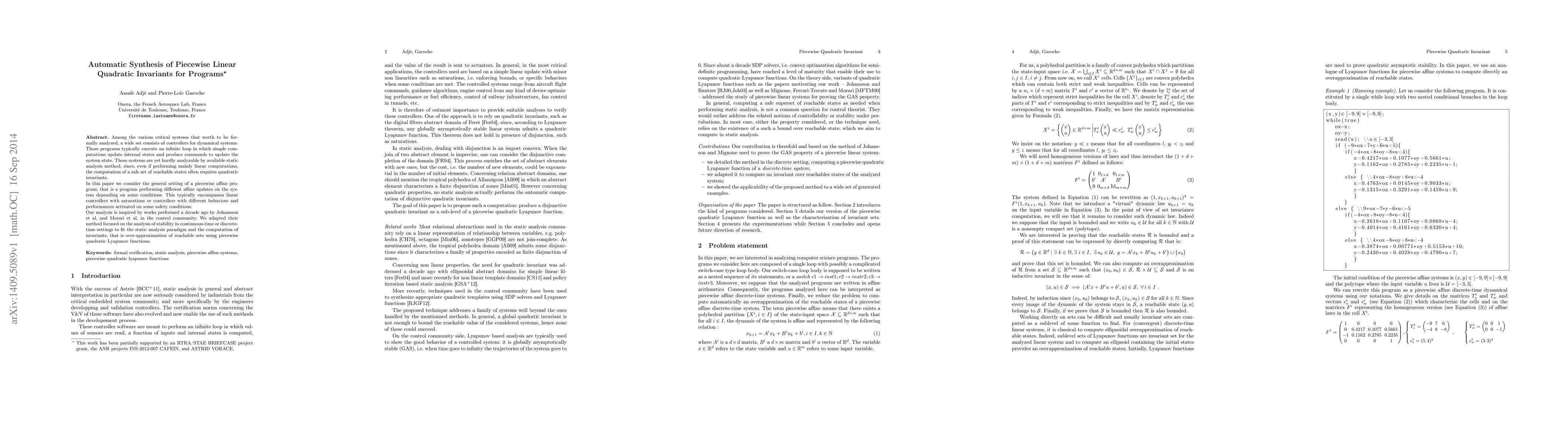 The paper presents a method for automatic synthesis of piecewise linear quadratic invariants for programs, specifically piecewise affine systems, using semi-definite programming (SDP) and quadratic Lyapunov functions. It adapts previous control theory methods to fit static analysis paradigms for computing invariants as over-approximations of reachable sets.